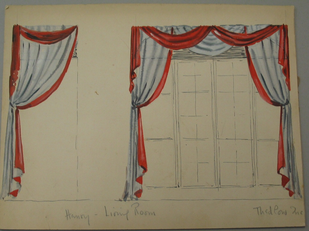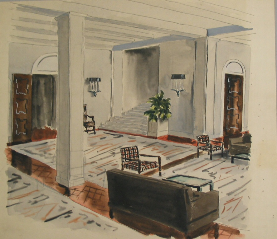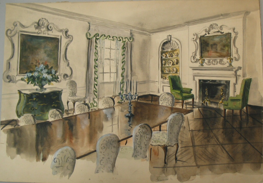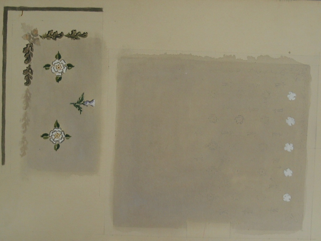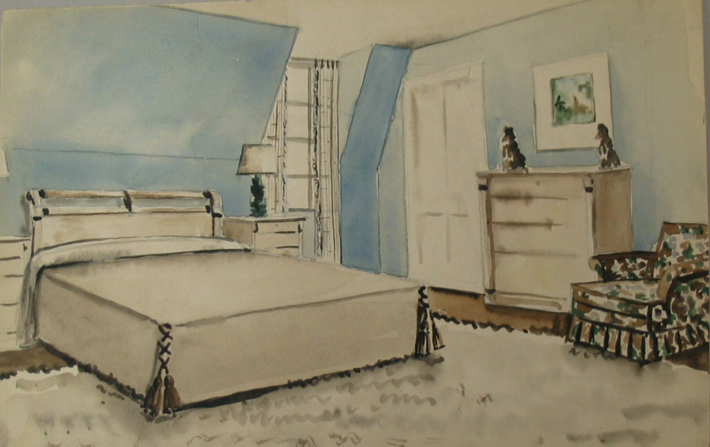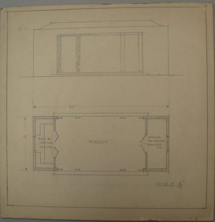 Plan and elevation (in pencil) of bar and serving counter porch, storage for garden furniture, etc.