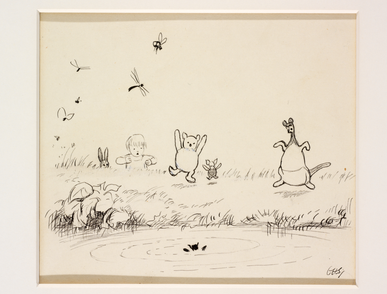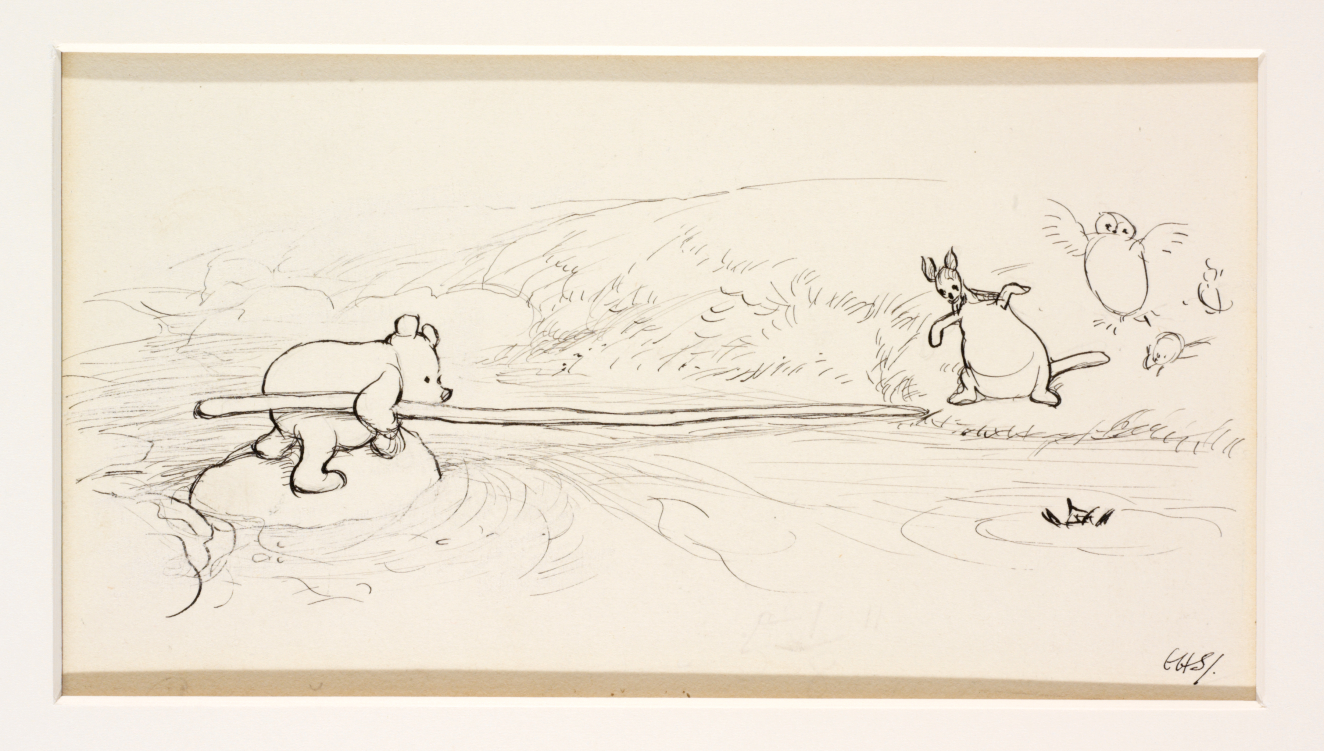 Winnie the Pooh Christopher Robbin, Piglet, and Kanga at the side of a pond