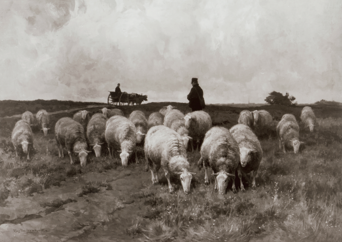 Chair at table in blue and white room with shutters that reveal a painted outdoors scene
