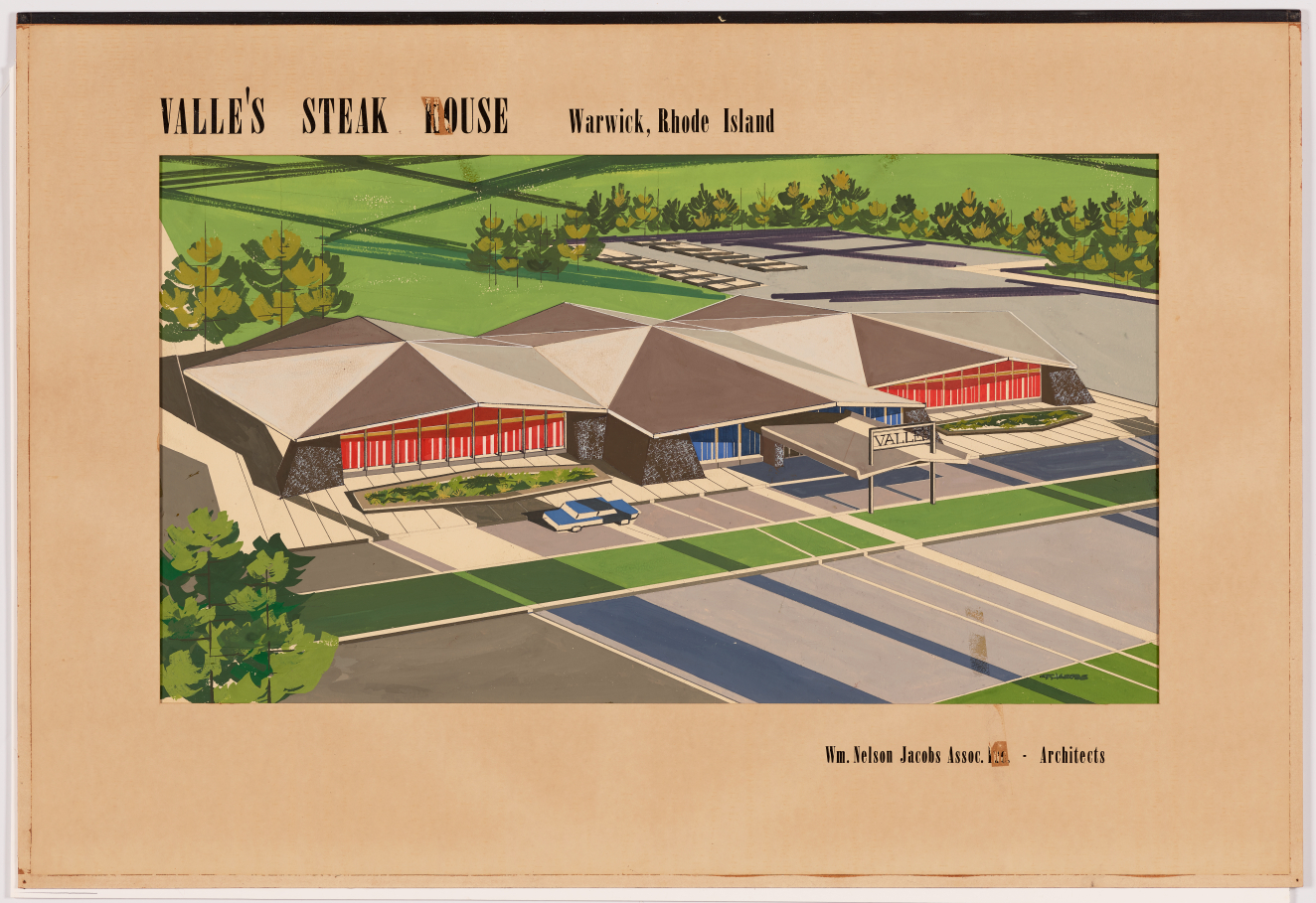 Red sofa against wall with grey and white checkerboard floor