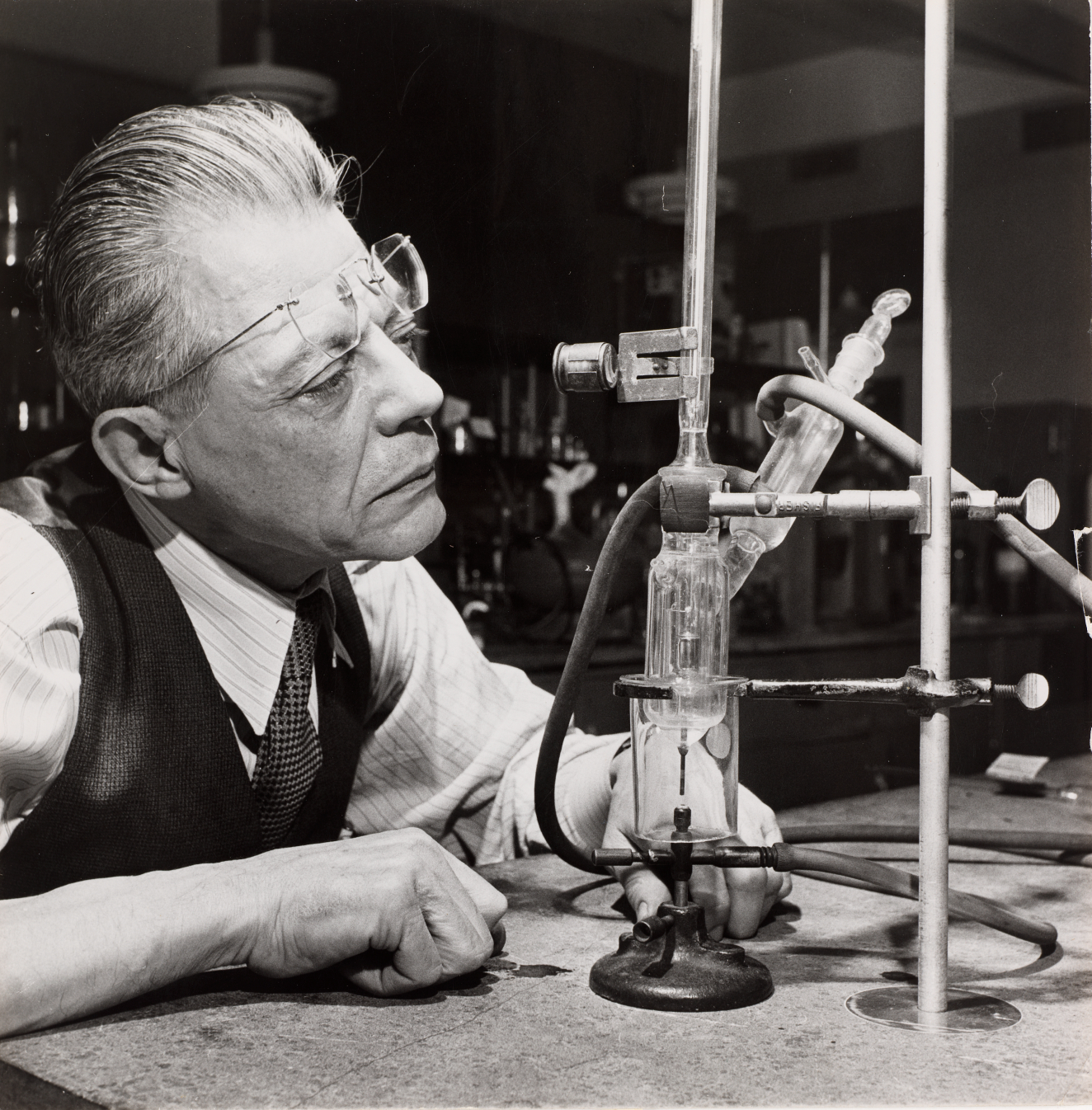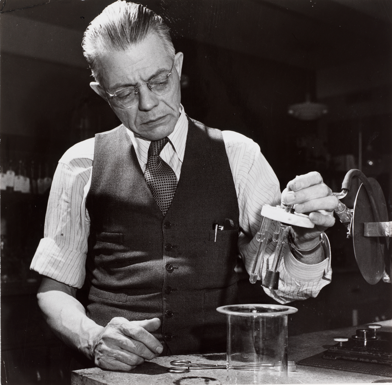 Chemist Julius V. Sommer prepares tiny fractionated samples for viscosity determination ca. 1943-1951