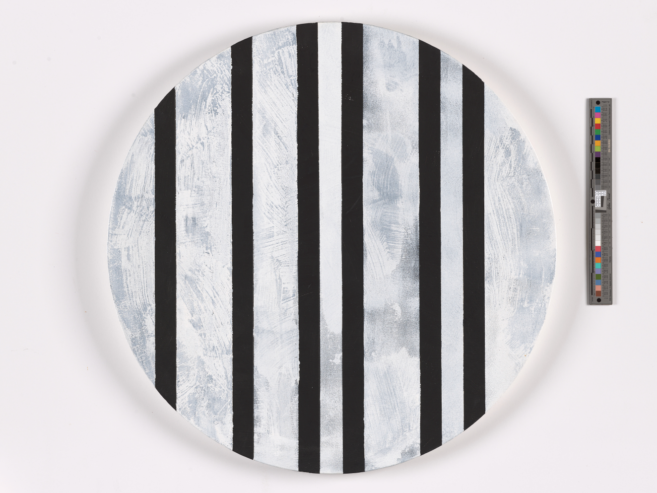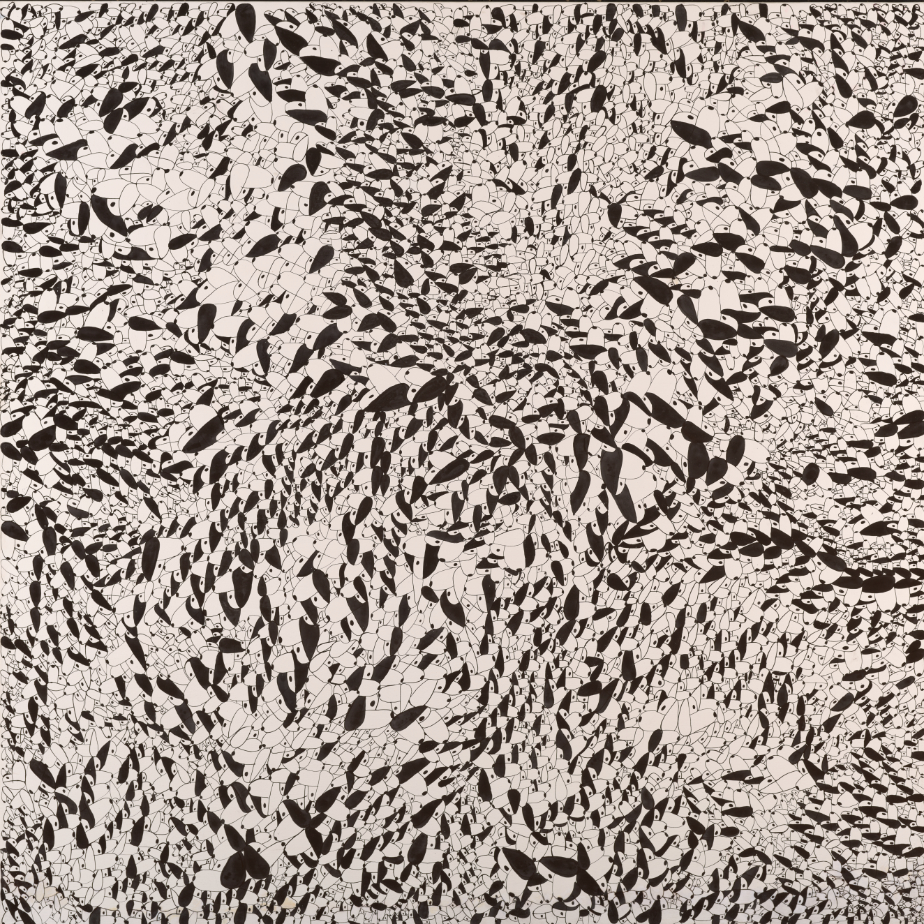 Various colorful images radiate from the center of the page, which features a yellow circle with brown designs. At the lower center, two figures light cigarettes.