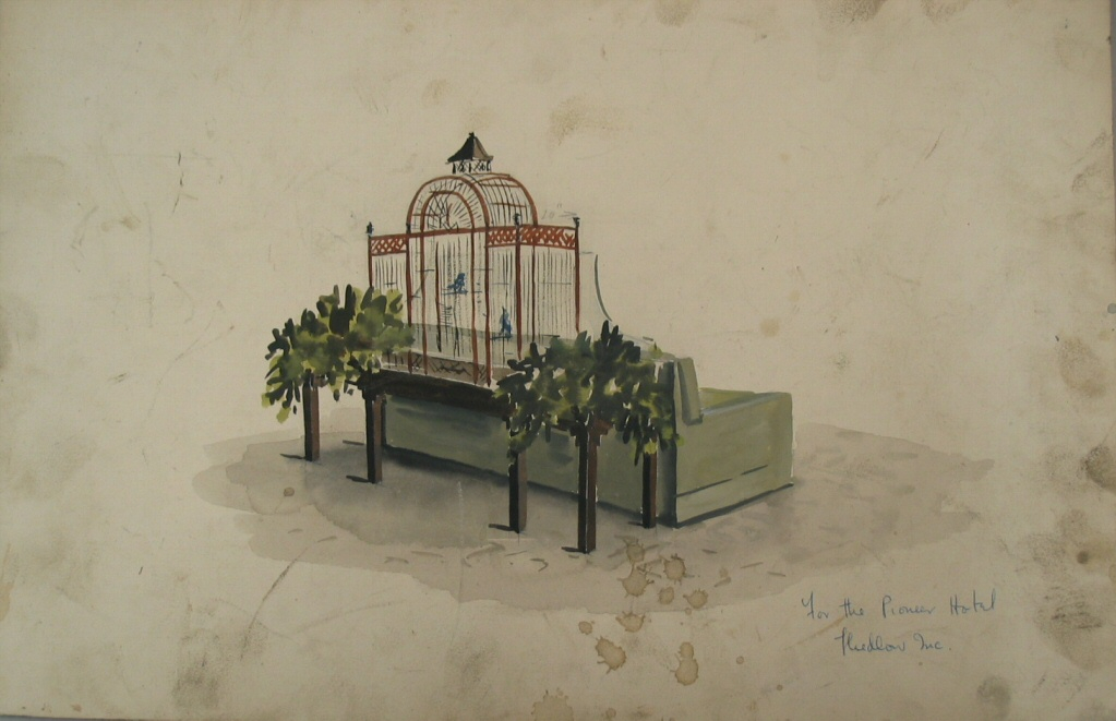 birdcage with foliage and couch for the Pioneer Hotel