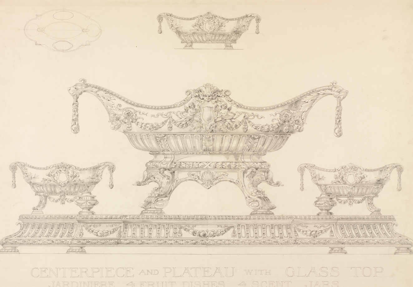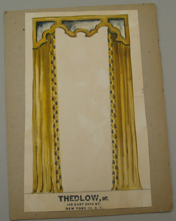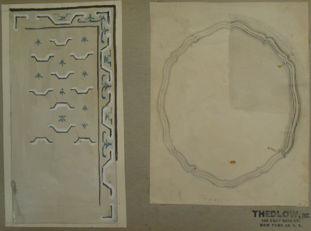 Chair at table in blue and white room with shutters that reveal a painted outdoors scene