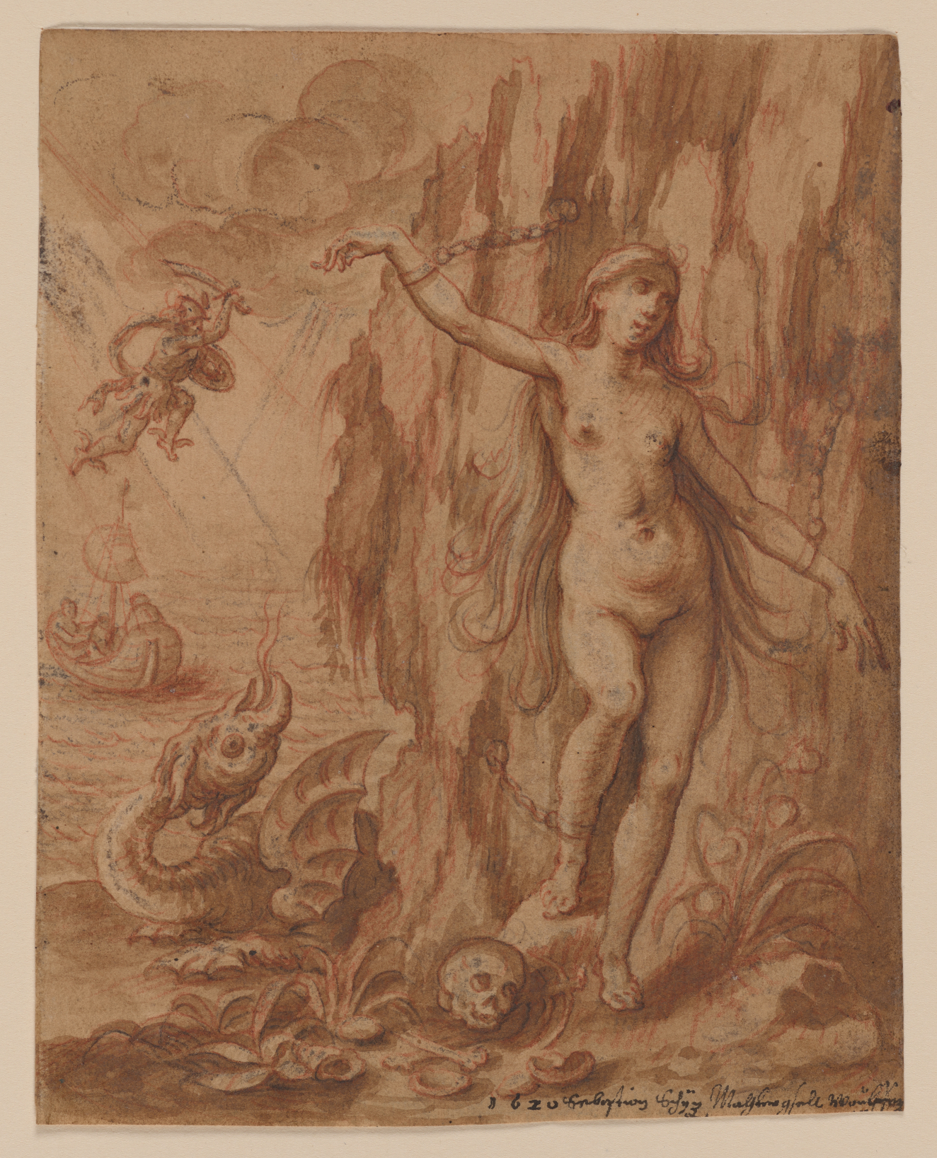 Double-sided sheet: Recto: Perseus and Andromeda; Verso: Man in a hat with four lines of verse and the word 'Enswih'