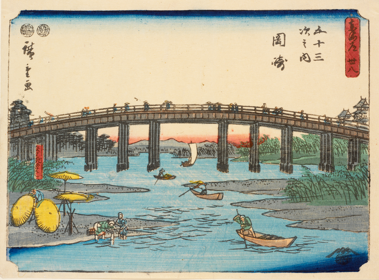Viewing Sunset over Ryōgoku Bridge from the Ommaya Embankment (Onmayagashi yori Ryōgokubashi no sekiyō o miru), Edo (Japanese period)