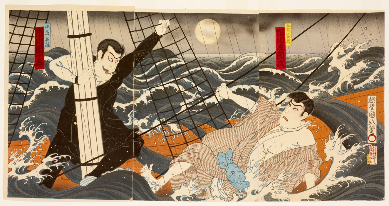The scene of the steamship sinking off the coast of Kii Province: the actors Ichikawa DanjuroIX as Kyoshi Kondo Tatsuo and Ichikawa Sadanji as Mikura Tomizo, Edo (Japanese period)