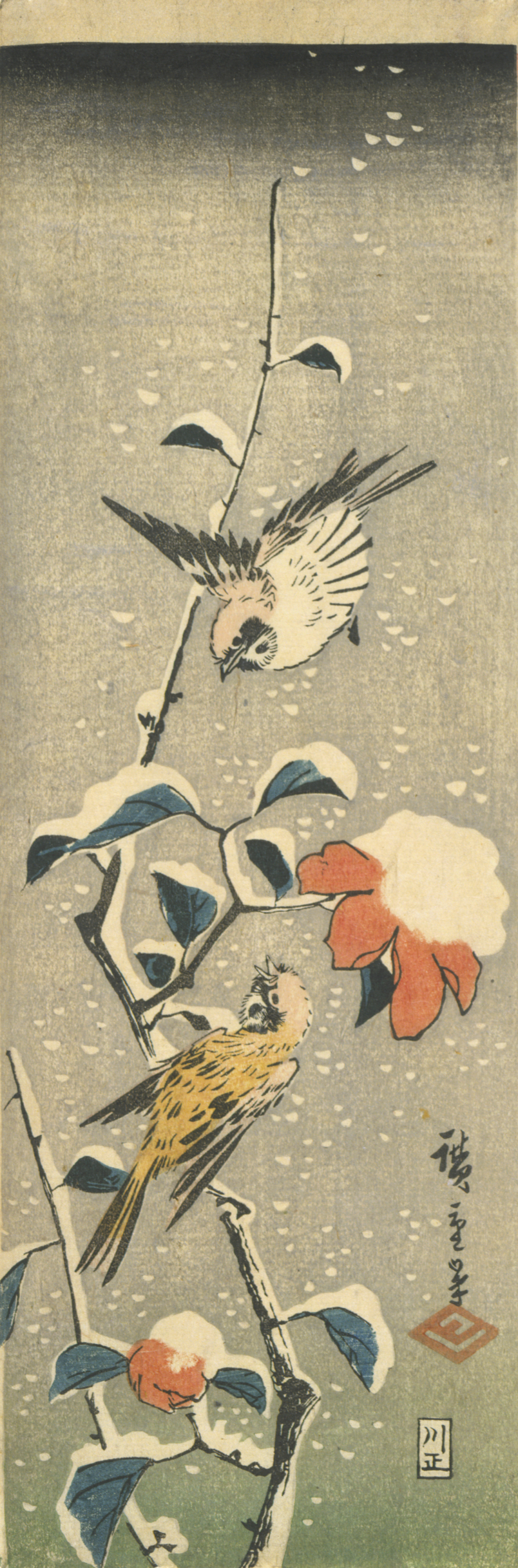 Bulbuls on snow-covered pine (Shimahiyodori yuki no matsu), Edo Period