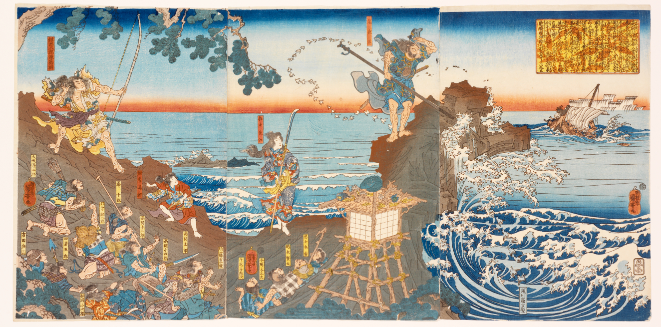 With a single arrow-shot Tametomo sinks the finest ship of Mochimitsu as his mistress Sasaraye and his retainer Oniyasha and islanders look on in pride (Chinzei hachiro Minamoto no tametomo), Edo (Japanese period)