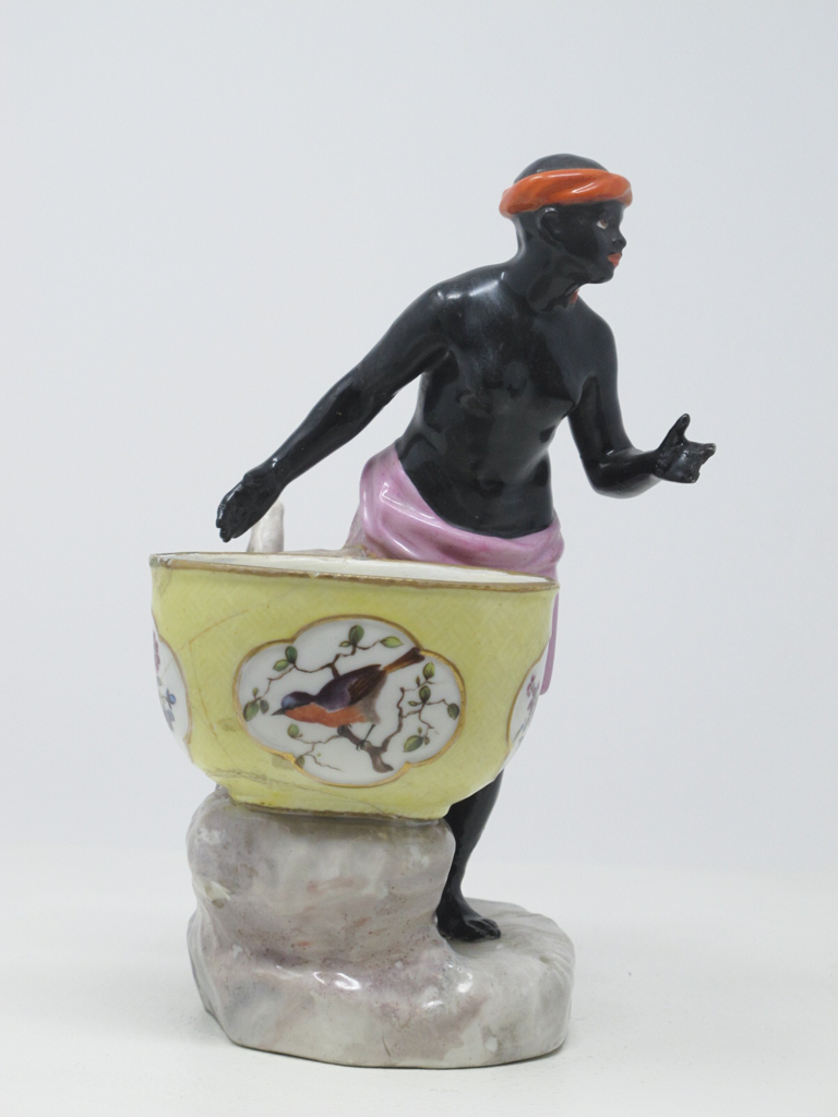 A sculpture of a woman holding a child on top of a rectangular base, covered in red, white, and brown stripes.