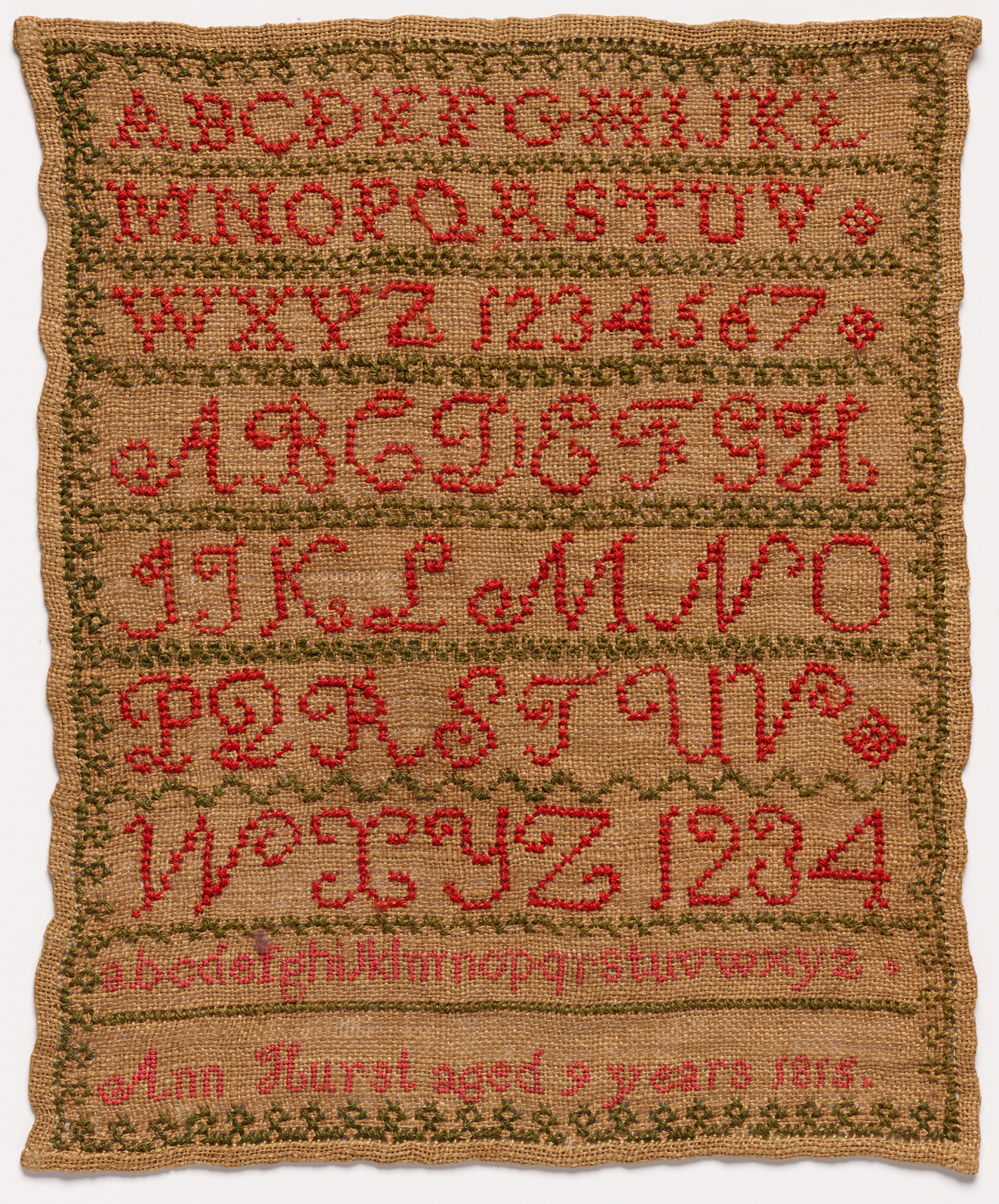 A sculpture of a woman holding a child on top of a rectangular base, covered in red, white, and brown stripes.