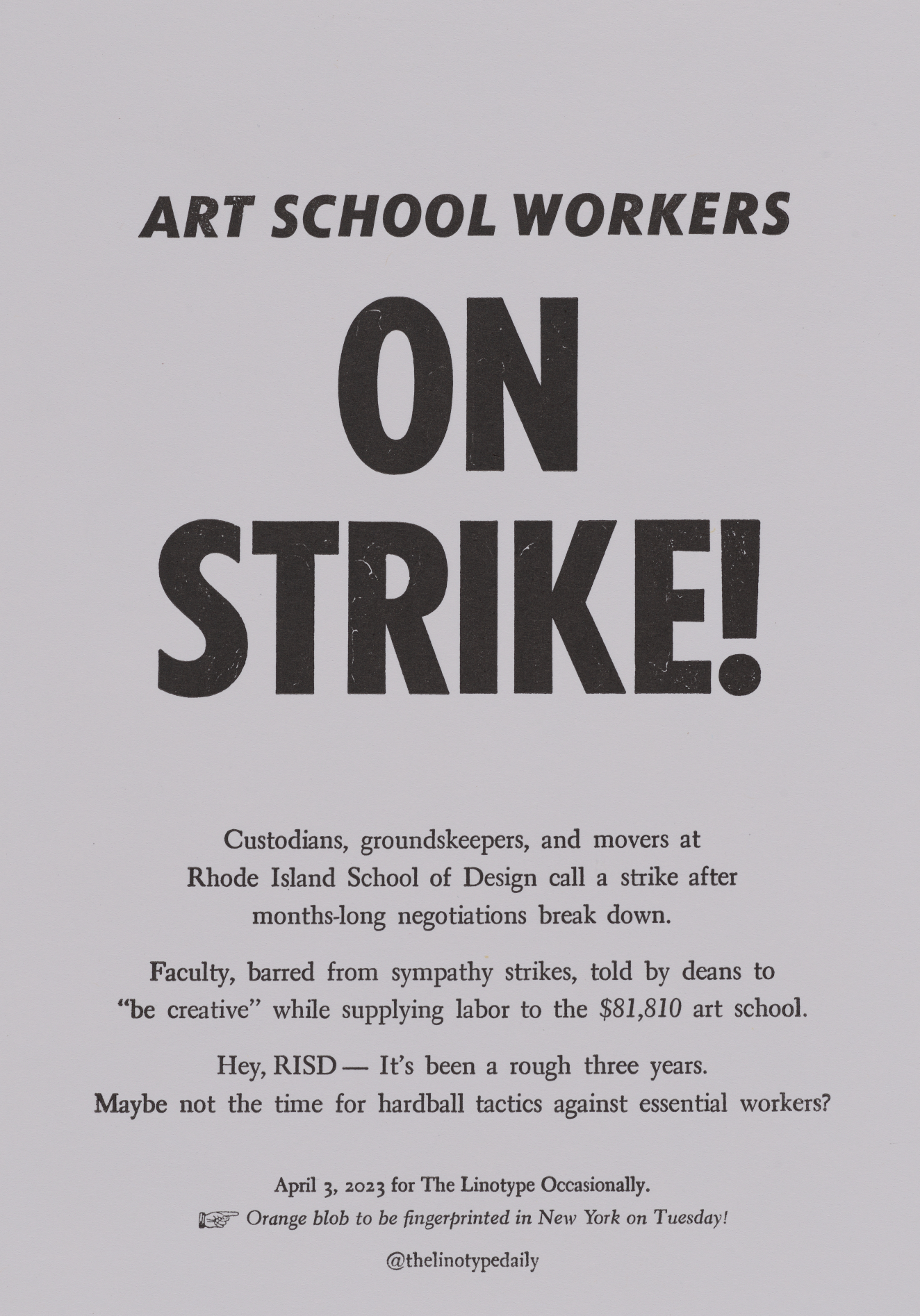 Art School Workers On Strike! April 3, 2023 for The Linotype Occasionally