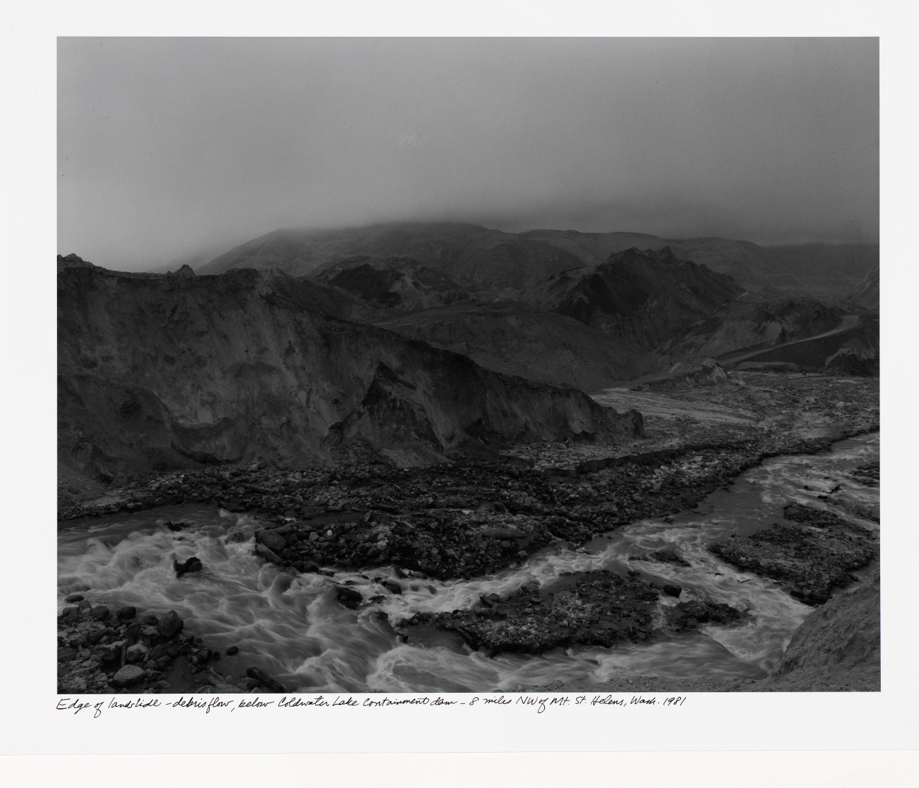 Edge of landslide - debris flow below Coldwater Lake containment dam - 8 miles NW of Mt. St. Helens, Washington