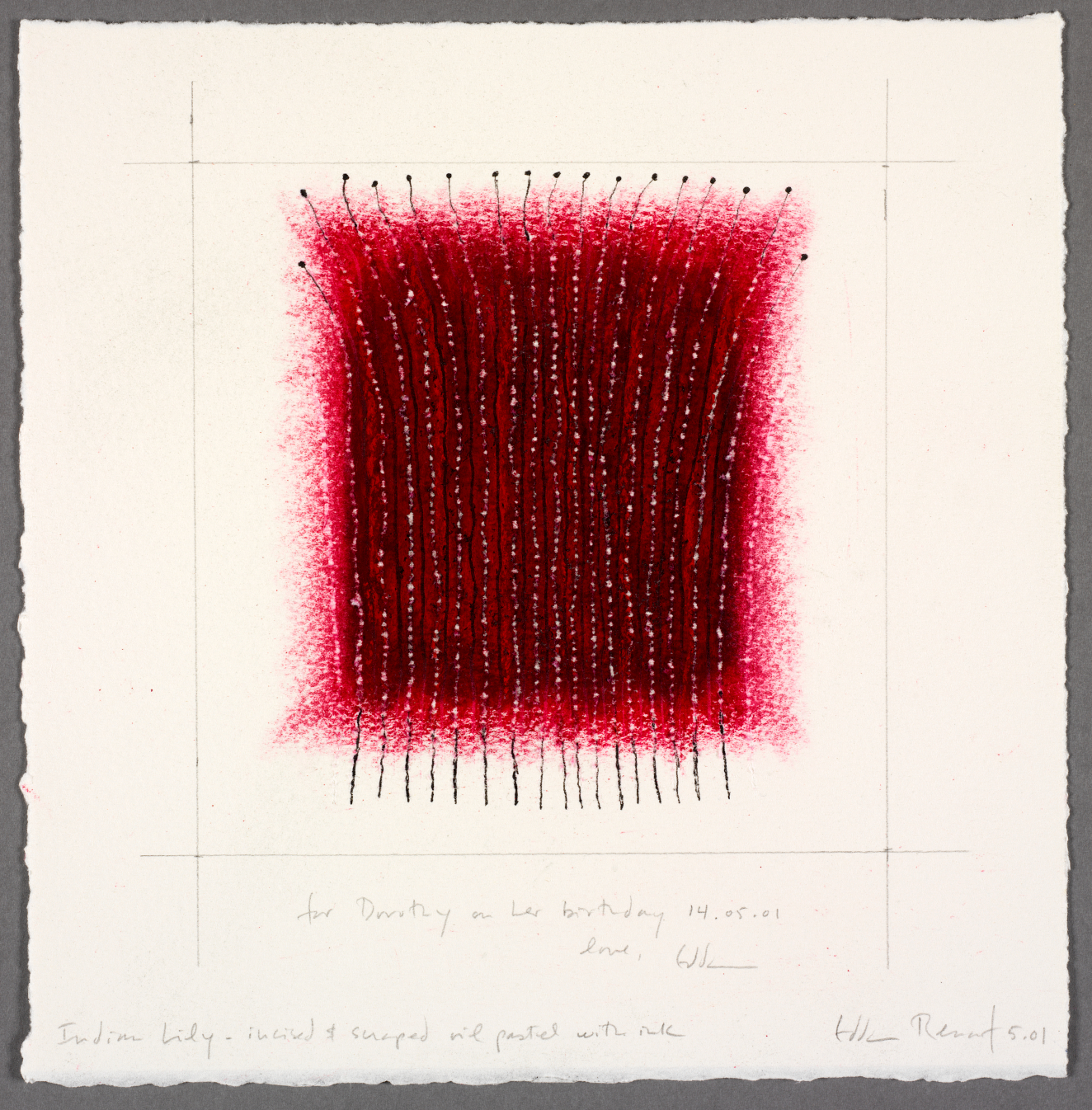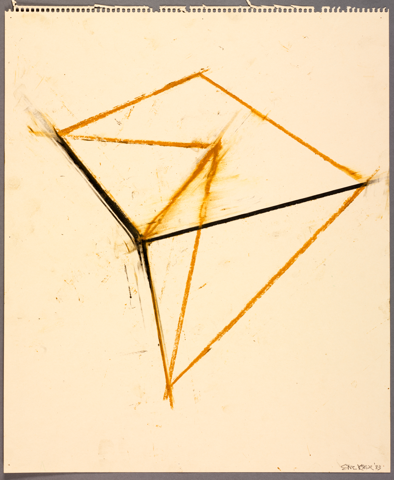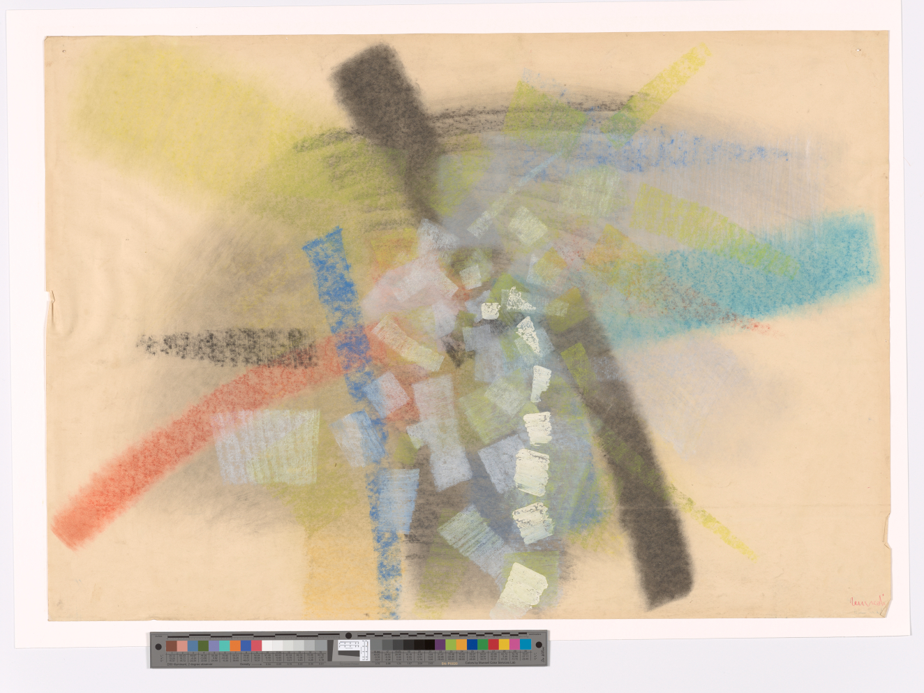A black-toned painting with ominous abstract, elongated forms, faint linear details, small geometric white details, and a small cluster of green, blue, and red color.