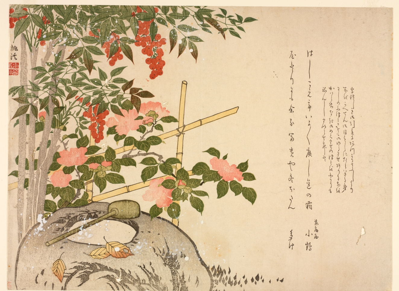 Nandina berries and wild roses in snow (Setchu nanten to yamabuki), Edo Period