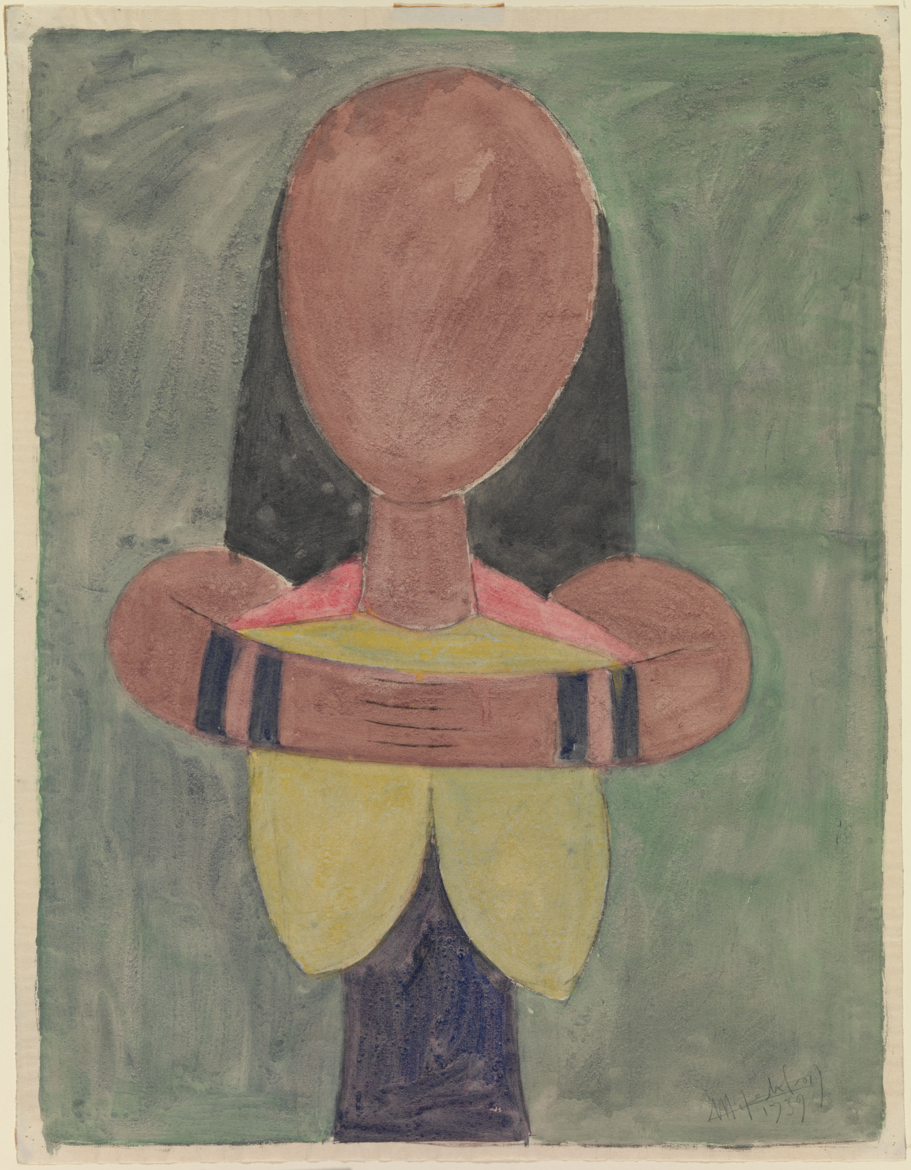 A painting of distorted, elongated humanoid and animal-like figures rendered with a light, muted color palette, their forms blending surreally into a shaded, textured background.