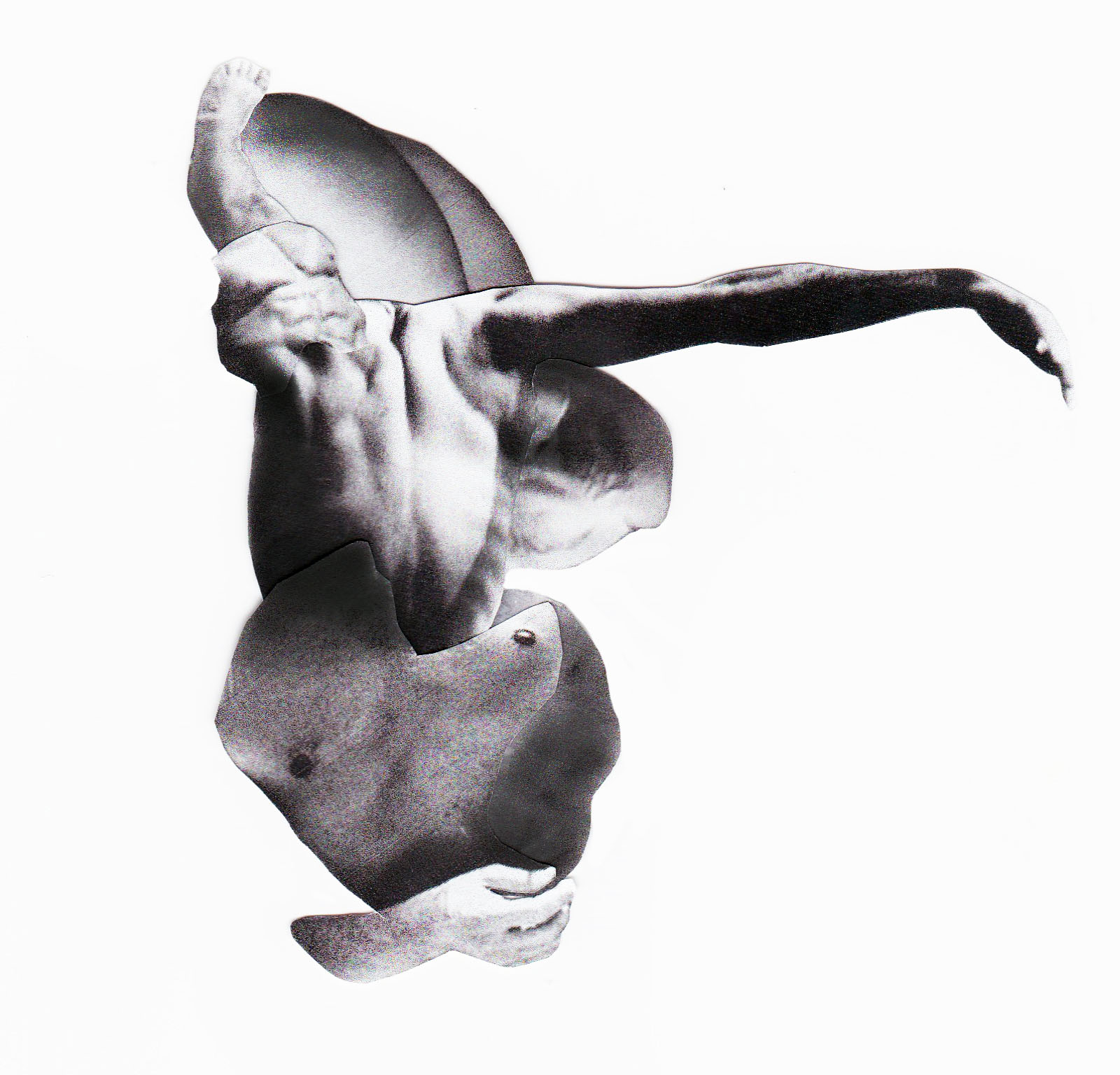 My process for creating these images is relatively simple, and I like it that way. I look through the collection and pick bodies with features that stand out to me, whether that’s the rippling muscles or exciting shapes of the pose. Then, I cut out these specific features and tape them together, sometimes pushing pieces together and seeing how they fit and other times carefully rearranging until the form is perfectly confusing. I edit them a little in Photoshop, raising the contrast and blending shadows or highlights to create a more seamless look.