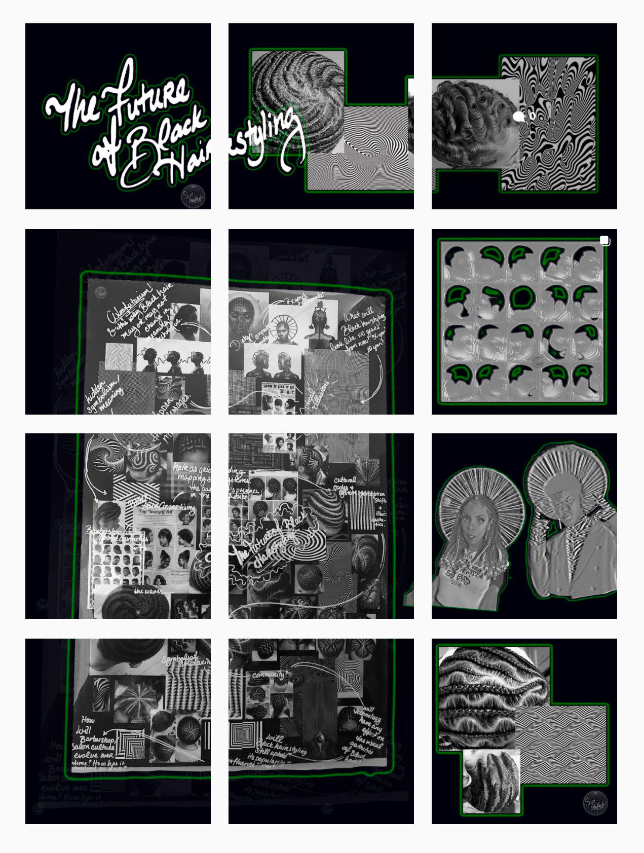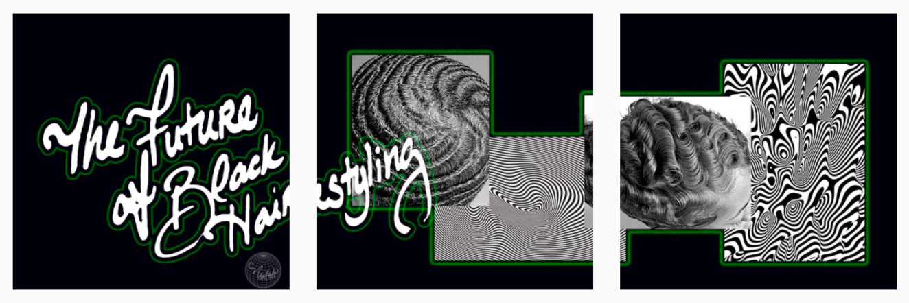 The Instagram page I created for this idea, @blackhair.future, showcases a full spread with the poster I created, along with specific images of reference pulled from it and inspired by it. In the captions of some of the posts, I ask questions about the future possibilities of Black hair. In other captions, I use quotes from some of the class readings on hair and Afrofuturism, including Tanisha C. Ford's “Liberated Threads: Black Women, Style, and the Global Politics of Soul," Mark Dery’s “Black to the Future,” and Kobena Mercer’s “Black Hair Politics." As previously stated, this is a physical poster that speaks on futuristic aspects of Black hair, so I wanted to bring this poster to the digital world in an interesting way. Some of the specific reference points pulled from the poster as separate elements of the spread include photo comparisons of optical illusions and hairstyles, as well as an AI-generated barbershop poster I created.