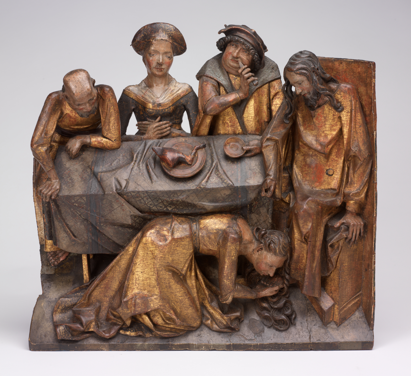 Christ in the House of Simon the Pharisee was once part of the complexly decorated main altarpiece now reconstructed at Saint Michael’s Cathedral (above). The sculpture, in the top right-hand corner, occupied a small crevice of the altarpiece, which is centered round Christ’s admission of good and evil souls into heaven and hell. On the lower lefthand side of the image is a facsimile of the sculpture of Joachim and Anna (now at the Metropolitan Museum of Art) meeting at the Golden Gate after Joachim has been informed that they will finally have a child, and that this child will be the mother of God. The altarpiece, then, seems to emphasize the role of prayer, good deeds, forgiveness and judgment by combining scenes of deep emotion from the Christian tradition alongside one of the final judgment in the afterlife. As the work was a composite altarpiece and not originally intended as separate works, there is no record of each individual sculpture having a title, and the RISD title, Christ in the House of Simon the Pharisee, is retrospective. It is only retrospective, however, insofar as the title was not given by the artist in the way that we associate today with the title of a work. The title of the story in the gospel of Luke, however, was already entitled as such and it is therefore likely that the sculpture would have been referred to by the name Christ in the House of Simon the Pharisee long before it was officially christened so.