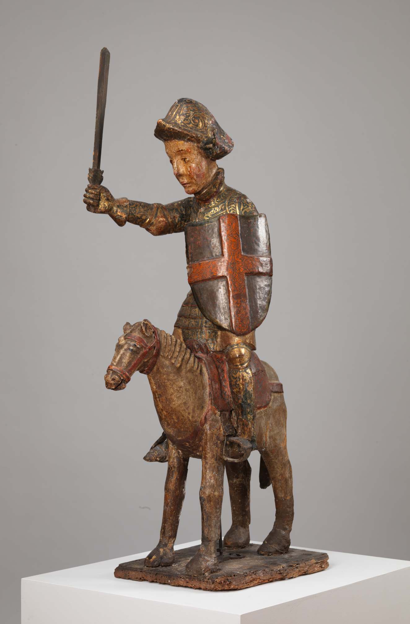 By the fifteenth century, when this statue was produced, Saint George was usually shown on the back of a white horse, bearing a shield with a red cross and preparing to slay a dragon.1 The RISD knight bears a red cross similar to Saint George’s on his shield. However, there is no dragon in RISD’s sculpture, nor is the knight’s sword tilted as if he were about to kill a dragon that has now been lost. Additionally, the horse in the RISD sculpture is not white, and there is no evidence that it has been repainted. These differences between RISD’s statute and the iconography of Saint George that had become set by the later Middle Ages make it unlikely the saint is Saint George.