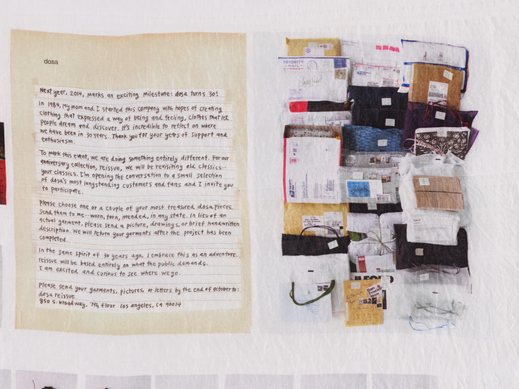 The recognition of a garment’s power to serve as a talisman as its wearer navigates life’s vicissitudes lies at the core of dosa’s 2014 Traveler “reissue” collection. To mark the milestone of dosa’s thirtieth anniversary, Christina Kim sent a personal letter to 150 customers and friends who have supported the label’s ethos over the course of its own threedecade-long journey. She wrote: “In 1984, my mom and I started this company with hopes of creating clothing that expressed a way of being and feeling, clothes that let people dream and discover.” She went on to explain that the anniversary collection will revisit “old classics—your classics” and, for inspiration, asked for a favor: “Please choose one or a couple of your most treasured dosa pieces. Send them to me—worn, torn, mended, in any state.” A scarf issued as part of the collection illustrates the letter, as well as the responses it elicited (Fig.3). Beloved dosa garments folded into mailing boxes and hand-delivered tucked into the company's signature scrap-fabric bags arrived by the dozens, including two well-worn versions of the indigo-dyed-travel coat from dosa’s Traveler 2006 collection, individually sent by creative producer Jodi Rappaport and graphic designer Lorraine Wild (Fig. 4).