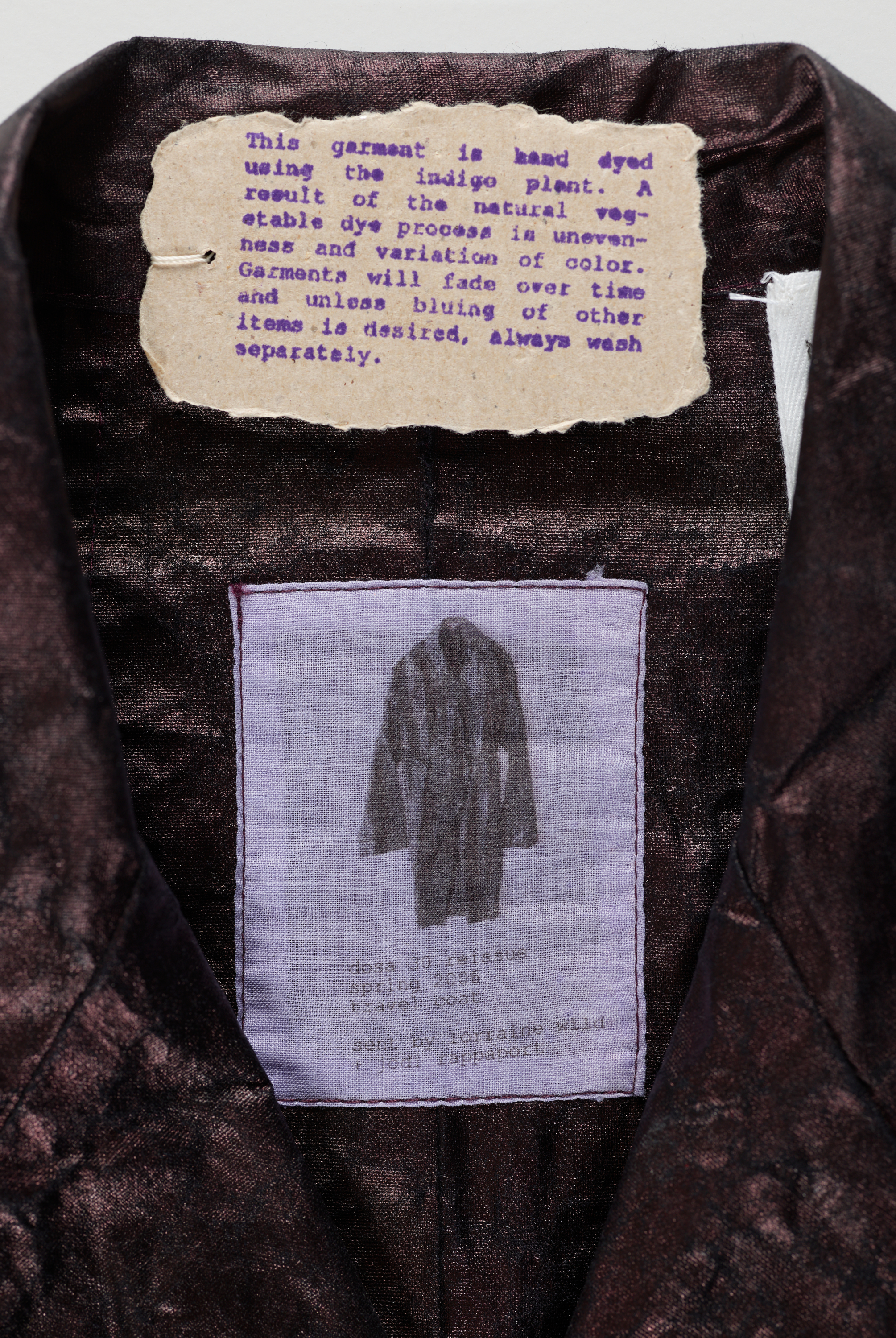 Such is a firsthand impression of the coat’s exterior. Unbuttoning the envelope of the fabric and moving to the interior reveals a cloth label printed with the ghost image of a strikingly similar garment that appears aged and tantalizingly softened with years of wear and subsequent care (Fig. 2). Typed text below the hazy illustration presents some of the coat’s secrets: “dosa 30 reissue / spring 2006 / travel coat / sent by Lorraine Wild / + Jodi Rappaport.” Another label, this one of raw-edged handmade paper, tells us that the garment was “hand dyed using the indigo plant” and alerts us to a probable future of color shifts and variations, of eventual fading with use and potential “blueing” of adjacent items as the hue travels with the coat, rubbing off, reflecting habitual movements, and thus recording the wearer’s journeys.
