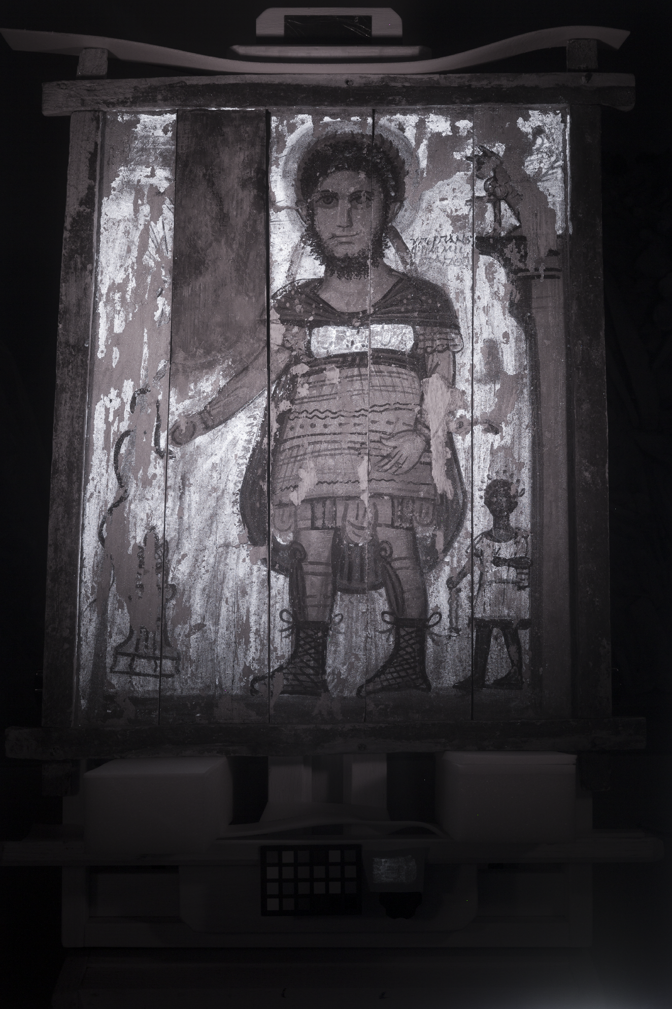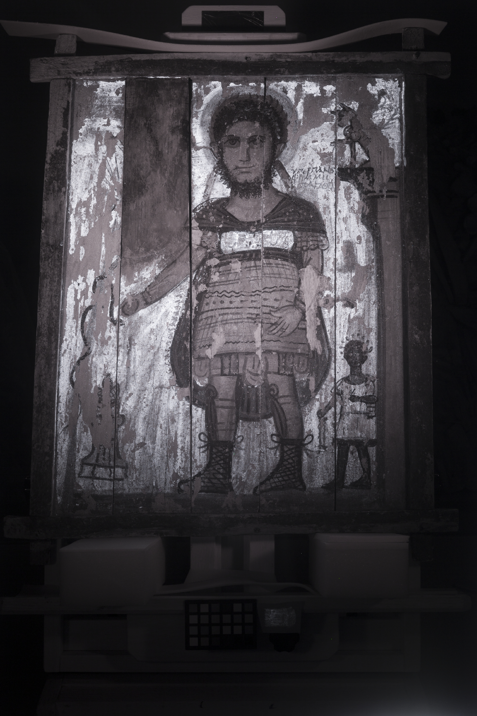 The portrait of the god Heron is shown under UV light, where Egyptian blue is seen as bright white.