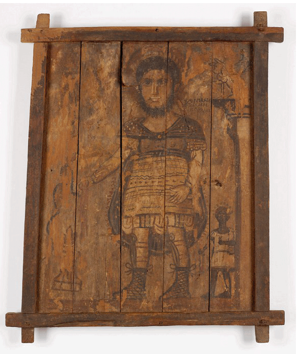 Once colors of remaining pigments were determined, missing sections of the painting were carefully examined. To the proper right of Heron remain parts of an altar, over which he is pouring libations. Other existing portraits of gods from this era suggest that the missing element to the proper right of the altar could be a snake slithering up a tree. To the proper left of Heron sits Nemesis atop a column, facing him. The figure presumably holds a wheel with spokes. The digital restoration of the panel is just one depiction of what it could have originally looked like. Information about this panel and others like it can be found in Vincent Rondot’s book Derniers Visages des Dieux D’Egypte.