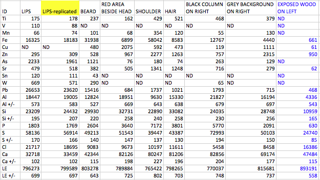 Microscopic samples of the portrait were taken to determine the chemical composition of the different pigments used in the painting.