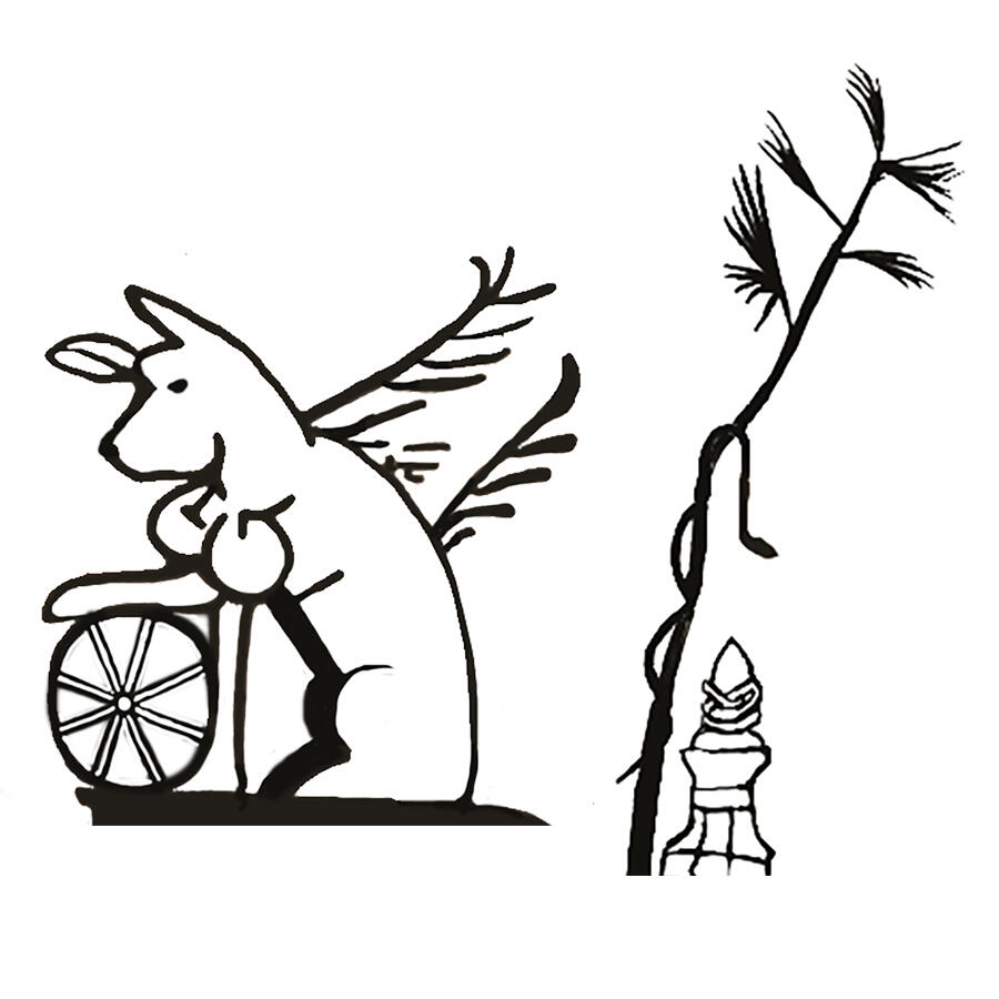 Sketches of possible depictions of Nemesis atop a column proper left of the god Heron, and tree with snake and altar, proper right.