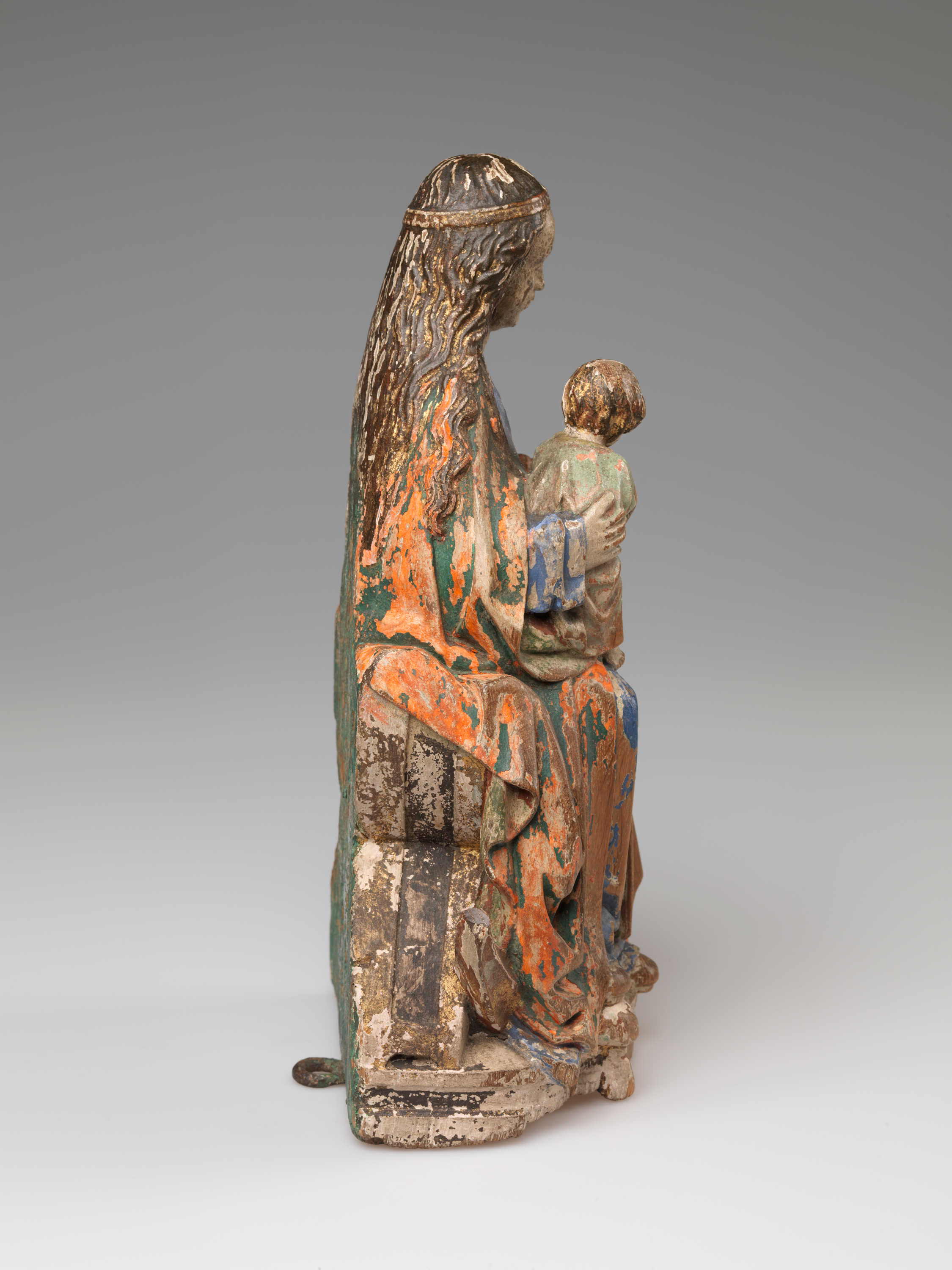 The small size and relatively light weight of the wood also made the Virgin and Child an ideal portable sculpture—large enough to command a sense of presence, but small enough to be moved around. Mobility and functional flexibility is a hallmark of these sculptures stretching back to the Throne of Wisdom of preceding centuries. Typically, they were carved completely in the round to accommodate viewing from all angles. The RISD Virgin and Child was probably carved in the round like the other extant versions, but at some point the back was cut down and painted over.