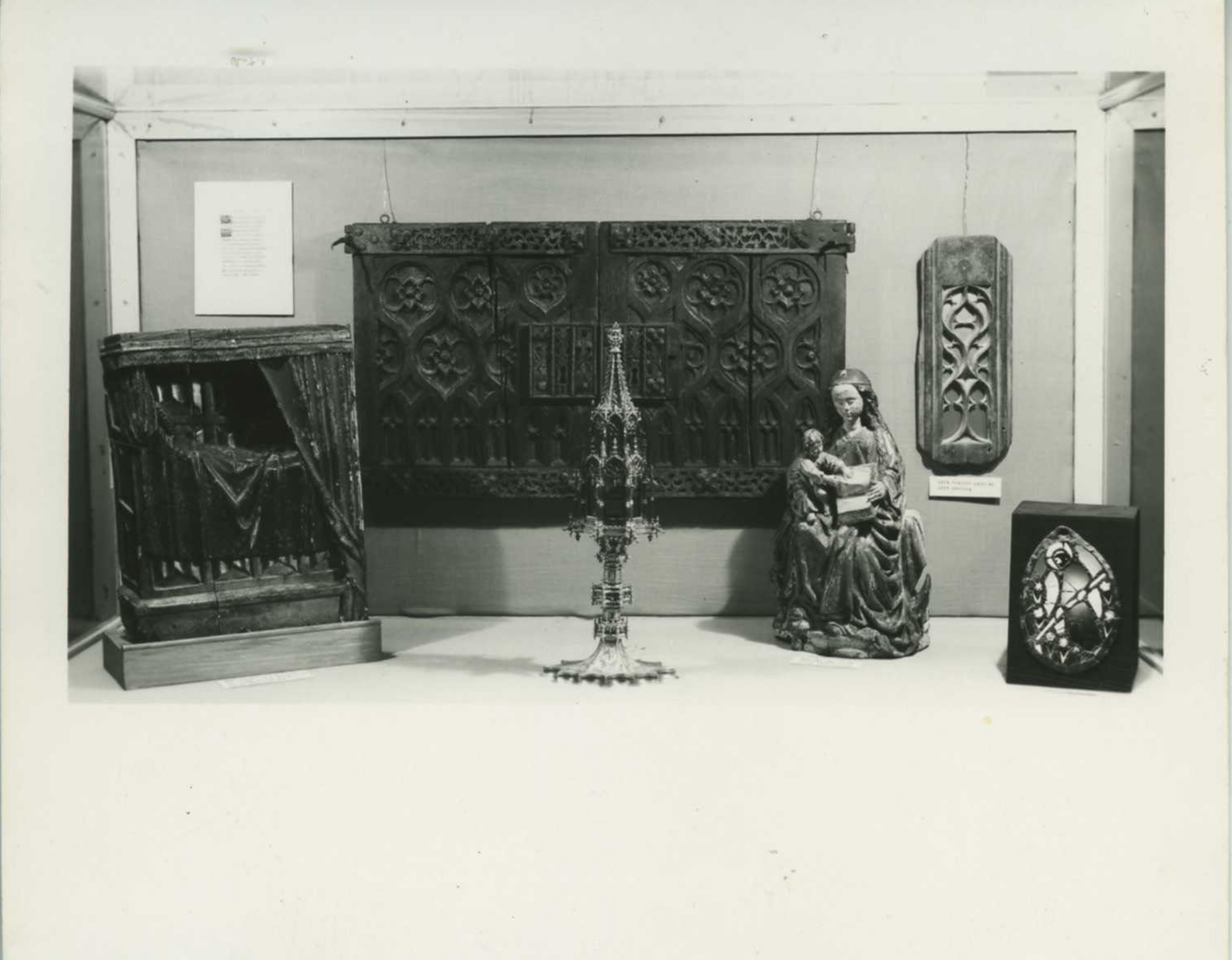 Virgin and Child (15.108) in a RISD Museum traveling education exhibition labeled "Gothic," 1940s–50s. Unknown photographer. Gelatin silver print. RISD Museum archives.