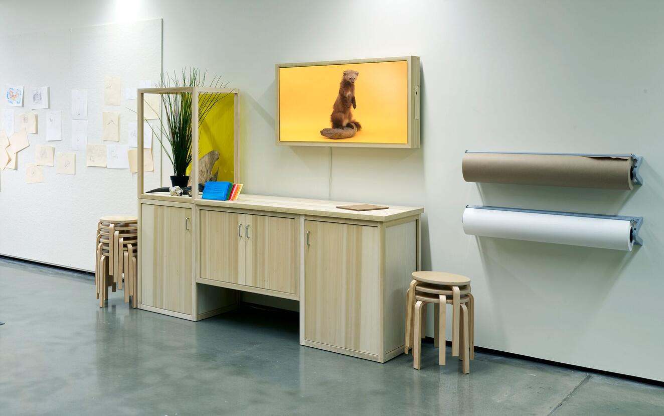 We began our design process by researching drawing classrooms, looking at historic art-school arrangements and furniture and more temporary pop-up spaces. As a museum connected to an art school, we were interested in making the space not unlike RISD drawing studios. We looked to traditional assignments, and to the roles figure and still-life drawing play in learning how to draw. We were also thinking about the fantastic resource that is RISD’s Edna Lawrence Nature Lab.