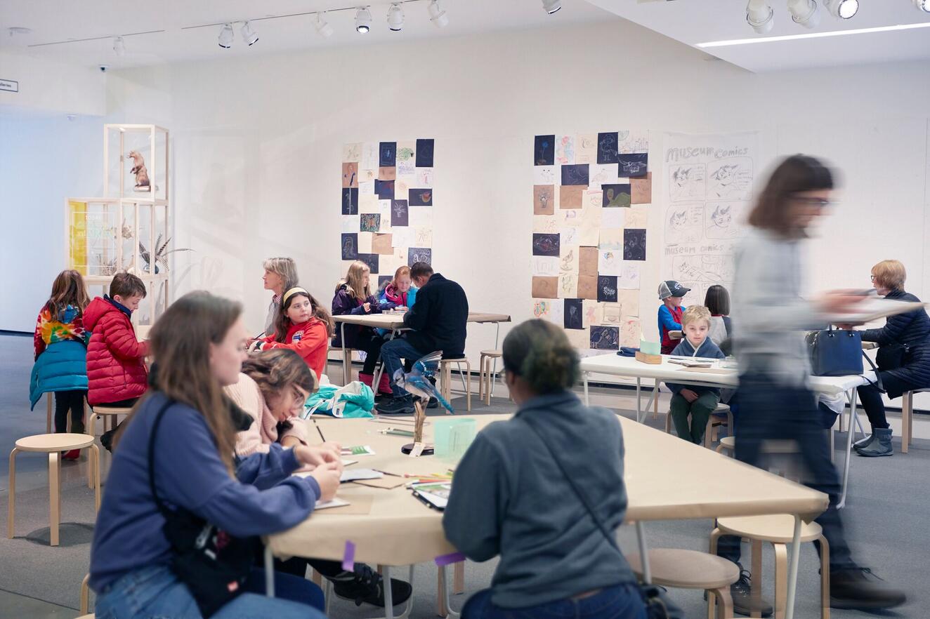 With the Education Department, the design team developed a series of nine different drawing prompts that visitors could use to create drawings for themselves. Prompts were printed individually on their own colored cards in English and Spanish. A loop of videos illustrating the prompts being followed played on a large screen in the space above where the drawing materials were stored. To inspire others and show all the drawing be done in the space, we designated a large Homasote-covered wall as an evolving gallery of participant’s work.