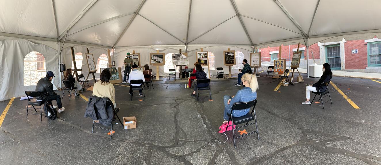 Following an abbreviated spring break, students returned for desk crits on their three household objects. For their final deliverables, the students were again required to create each object out of a singular material to focus the expression on the form. These three objects became a collection driven by one insight. The projects didn’t have to function but signifiers of the function were important. For example, a watering can could be made of foam; it would need a handle and a spout but didn’t need to be hollow or actually hold water. Students were asked to create one to two posters that showed the artwork, their sketch models, any sketches and their final project. The presentation was on our virtual day and the students asked for an in-person review. I reserved the tent next to the Industrial Design building and requested easels. It was windy and loud but nice to be in person. Our museum partner joined for the review.