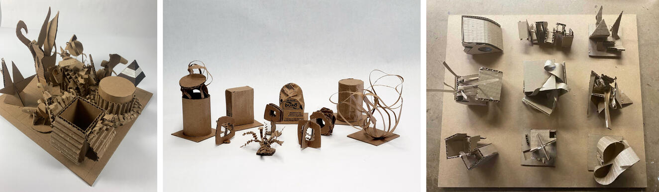 To start off this assignment, I wanted students to experience a divergent process and to use their critical thinking to make choices between generative and non-generative insights. Students would eventually be choosing one insight but were initially asked to try out multiple insights: at least three from each of the three works of art, for a total of nine. For homework, students (still in their teams of two) would use each of these insights as the driver of nine small 3”x3”x3” sculptures. Students were directed to stick to one material, to encourage them to focus on form, rather than material, as the expressive element of the sculptures. Because one of the pitfalls of idea-driven form is a tendency towards literal explorations, we ended the day with a short abstraction exercise.