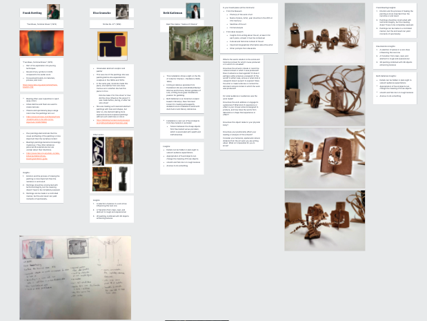 - encourage students to align their insights from the analysis of the visual and contextual research. Most students ended up using insights from visual analysis to drive the form of their projects. I believe this was because it’s difficult to take contextual insights and turn these abstract ideas into form (it’s much more intuitive to take a visual idea and create form) and thus the narratives from the contextual research—the historical context, the identity of the artist, etc—were lost. I imagine if students were able to align these contextual insights with formal insights then they could use the formal insights as the drivers for the form while allowing a meaningful narrative continuity with the artwork.