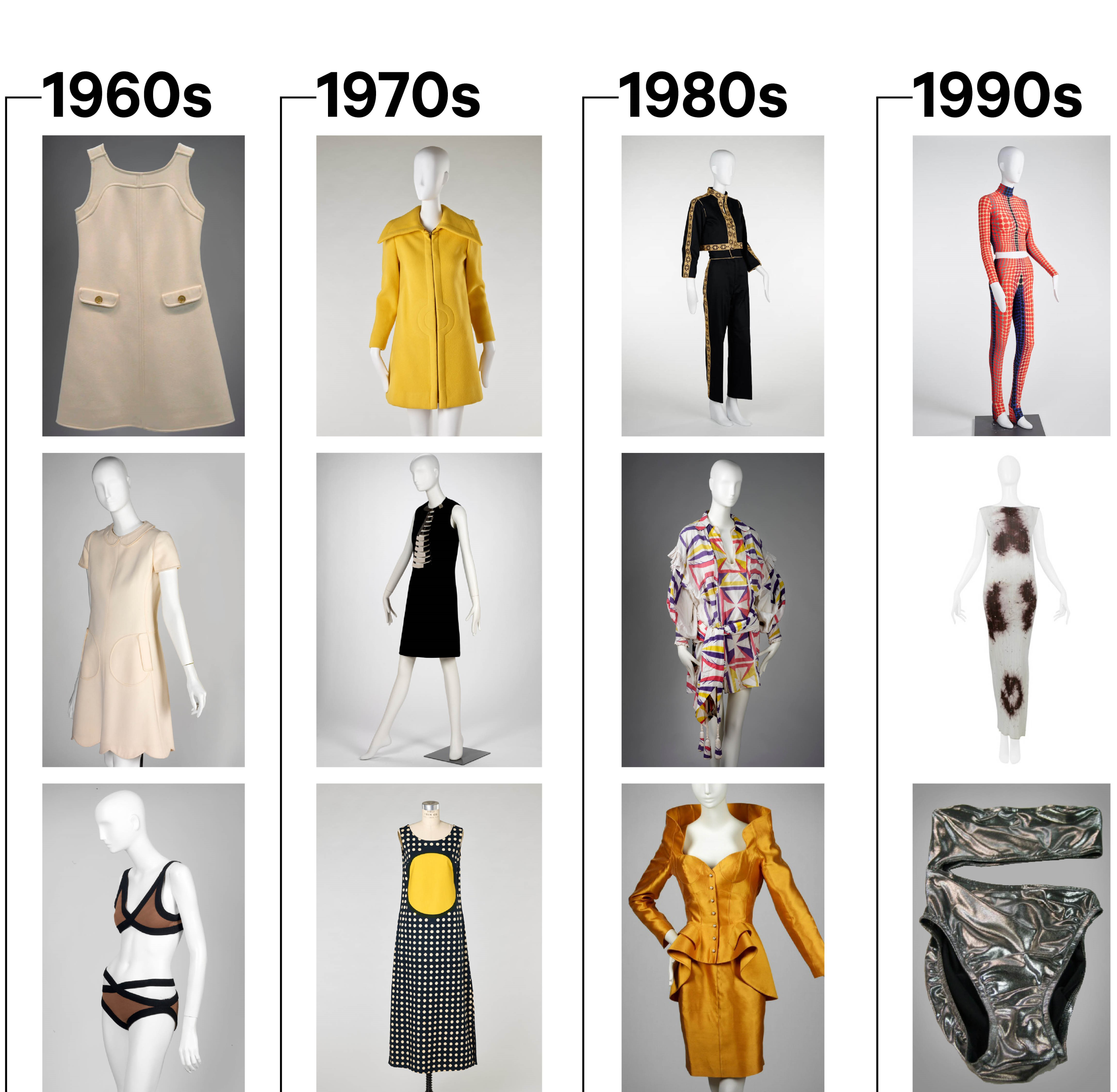 As humans, we are always trying to anticipate what is next—in our lives, in fashion trends, in science. Massive changes in technology have helped this urgency, as everyday tech and Artificial Intelligence (AI) make huge advances. This project was inspired by a JVC TV located in the Modern and Contemporary Galleries at the RISD Museum. It made me think about the sudden changes that happened in the 1960s, with the advancement in technology because of the space race, and how it affected society as a whole. From this idea I started to wonder: what does the future mean? How can we practice Futurism (the act of predicting or understanding future possibilities based on present ideas) and what it meant for our ancestors? As a costume and Textiles intern, I focused all these inquiries on fashion trends and designers from the 1960s to 1990s and how they expressed their own view of the future. This view is twofold: first, the influence of their surroundings and second, the sense of what “future” meant depending on the decade. The project grew and after a lot of research and object selection, it ended as an exhibition in the Donghia Costume and Textiles Study Center including the garments shown on the grid above. The biggest takeaway is to understand that, no matter the time in history, we are always hesitant about uncertainty and we—as a society—always find creative ways to express it.