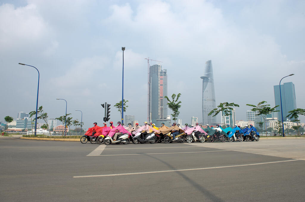 UTN: When I went back to Vietnam for the first time, I was amazed that most of the riders on the streets were unrecognizable. They were armed with colorful masks, helmets, riding jackets, sunglasses, and gloves. Most of the women also wear brightly decorated sun skirts that cover them from their waist down to their knees. I am very interested in this sense of anonymity. In my mind, the riders were equestrians with machine “horses.” And all the gear they wear makes them mysterious, like modern knights in full colorful armor. It also reflects the realities that Saigon’s people are facing. They are always fighting to protect themselves from the elements. Each morning, the energy present in the formation of hundreds of scooters waiting at red lights before marching forward is amazing. This sight made me think, and want to do something about it and with it.