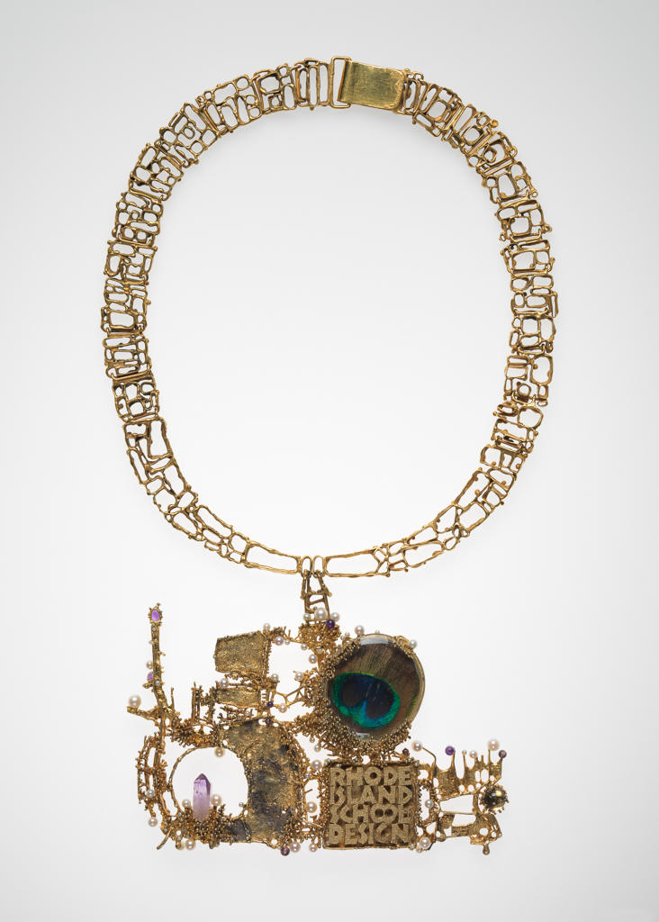 The RISD Museum is the home of two RISD chains of office. Both of these historic collars were created by faculty members and contain many symbolic elements. A typical university chain of office consists of a single medallion on a chain of silver or gold. They are meant to be timeless emblems and used by multiple generations of presidents. This specific RISD chain of office, however, shirks those traditional principles. Instead, it is an explosion of gold, silver, pearls, amethysts, glass, quartz, and a single peacock feather. It is an amalgamation of many different metalsmithing techniques and is able to fold in on itself for ease of transportation and storage. Its craftsmanship equals its symbolic importance. The various elements and the precise handling of the different materials further showcase the numerous abilities of its maker, Harold Schremmer, a professor of silversmithing and jewelry making at RISD between 1972-1974. In this way, the chain of office stands as a testament to the many skills RISD students must hone, as they work to attain their various degrees.