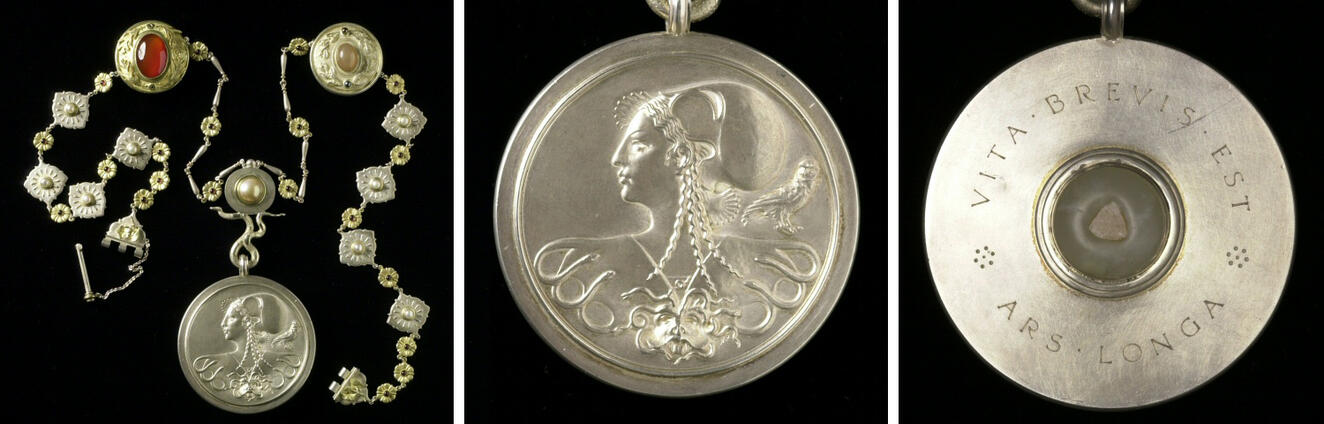 The RISD Museum also houses a second chain of office that was created by Merlin Szasz, a former foundation studies professor, for the inauguration of Roger Mandle in 1994. It is immediately apparent that this collar is significantly more traditional and less personalized than the 1975 chain of office. The chain’s central silver medallion depicts Athena, the Greek goddess of learning and the arts, on one side, and the motto VITA BREVIS EST ARS LONGA on the other. This quote from the Greek physician Hippocrates effectively translates to “life is short, art long.” The reverse of the medallion also showcases a fragment of marble from the Parthenon embedded in bowenite, the Rhode Island state mineral. These multiple allusions to ancient Greek culture and society recall RISD’s endeavor to combine studio arts with a more traditional and classical education founded in the liberal arts. The medallion is connected to the chain by a pearl and a serpent that indicate the triumph of enlightenment over ignorance. The large red stone that is set to the left of the central medallion and is mounted in a ring of golden oak leaves is carnelian. This stone is meant to represent the sun, wisdom, durability, strength, and the masculine principle. The corresponding stone to the right of the central medallion that is surrounded by a ring of silver mistletoe is moonstone. This setting recalls the moon, enlightenment, renewal, immortality, and the feminine principle. Even the clasp of the chain takes the form of a morning glory, a symbol of humility. By adhering to RISD’s tradition values, Szasz was able to craft a chain whose emblematic significance remains relevant to the college today. In fact, this chain is still used by the college for presidential inaugurations and commencements.