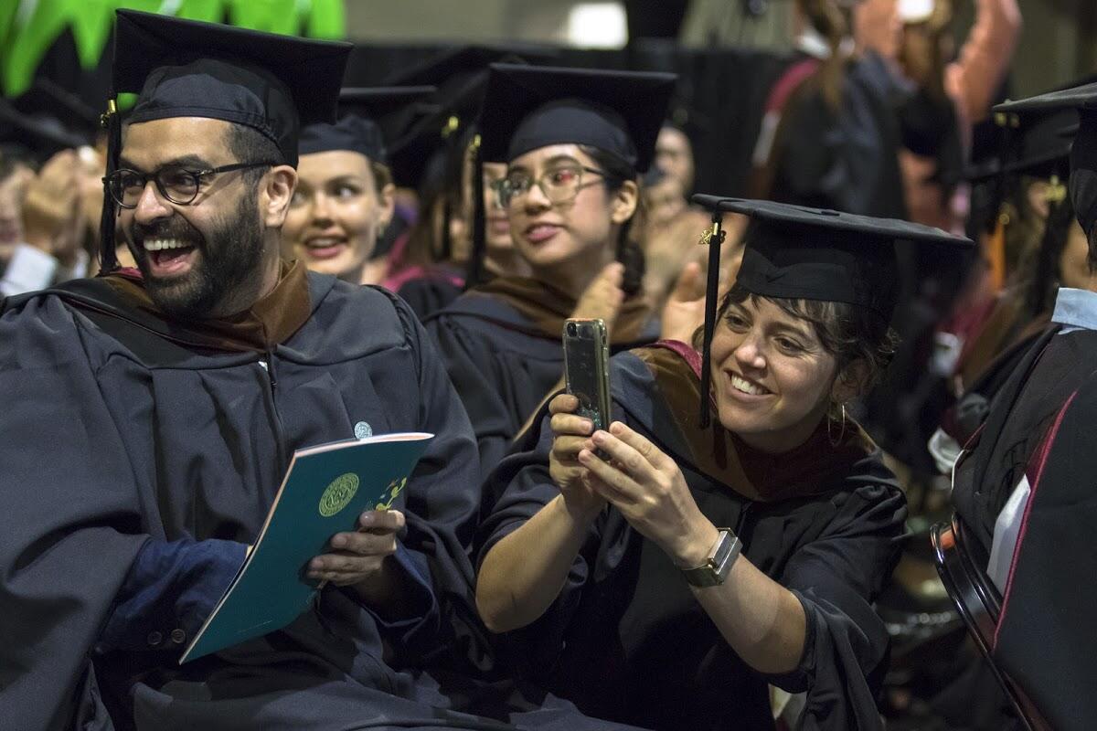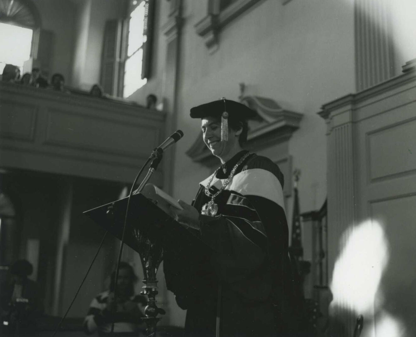 The way one dresses at commencement visually conveys one’s academic accomplishments. Those receiving a bachelor’s degree, for example, typically wear plain black robes. Those receiving master’s or doctoral degrees, on the other hand, don elaborate robes decorated with velour stripes and colorful hoods. Only the president of the university truly stands apart, however, as the only individual allowed to wear the university’s chain of office.