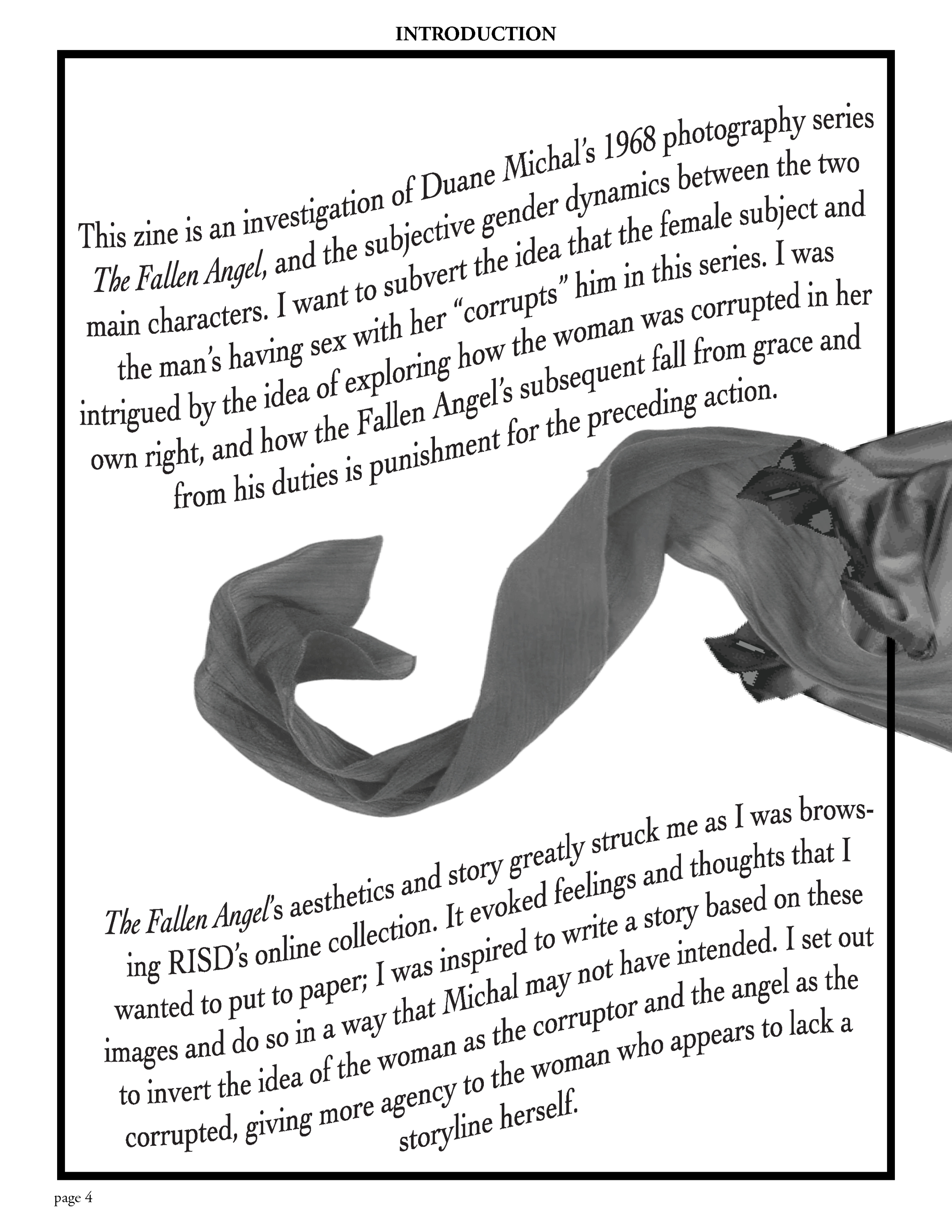 This zine is an investigation of Duane Michal’s 1968 photography series The Fallen Angel, and the subjective gender dynamics between the two main characters.
