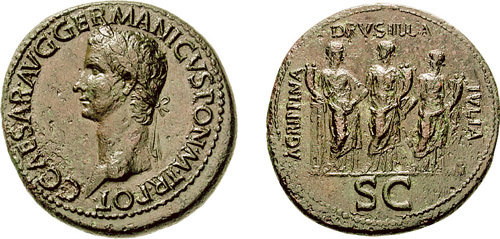 Sestertius from rule of Caligula. Front: Germanicus; Back: Agrippina the Younger and her sisters.