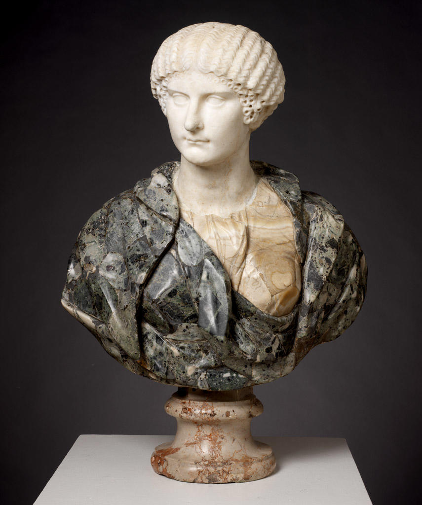 The bust of the statue—including the taupe tunic, green mantle, and socle (or simple pedestal)—is not ancient but likely from the 18th century and parallels other portraits we have from this era.Borromeo, “Looking an Empress in the Eye.” In addition to this theory, this article also contains a more detailed treatment of the 18th century additions. What does the addition say about 18th century tastes and perceptions of this portrait, and the larger question of how historical forces can shape perceptions of an object? To begin to answer these questions, one must first understand 18th century restoration practices. Often broken statutes were mended with new creations (for another example, the RISD Museum’s Figure in the Guise of Hermes; both the ancient body and removed leg of 18th century origin can be viewed in the Ancient Art Gallery). The addition of the bust in the case of the Agrippina perhaps was responding to a need to more easily display the piece and a perceived lack of color. The RISD Museum acquired the piece from a Marchioness of Linlithgow and before that it was probably proudly exhibited by many other wealthy individuals. Here these individuals used this piece in a similar manner to how we guessed Agrippina might have—to highlight nobility and power. These perceived deficiencies unawarely hit on the part that the portrait played in antiquity. As Borromeo elucidates, ancient statues of white marble were typically painted in vivid colors, thus this 18th century addition incidentally gives the contemporary museumgoer some indication of the effect that color would have added.Borromeo, “Looking an Empress in the Eye.” While this proves to be an interesting historical coincidence, one would err to imagine that this negates the history of this object and reverts it to some earlier form; rather, these additions present a visual manifestation of how viewers of different periods can bring something of their own age to a work, so as to inscribe new meaning and shed light on aspects that have long laid dormant. As the literary critic and theorist Stephen Greenblatt states, “Cultural artifacts do not stay still, . . . they exist in time, and . . . they are bound up with personal and institutional conflicts, negotiations, and appropriations.” One would be remiss to see Agrippina’s portrait at the RISD Museum and assume its significance was locked up in Imperial Rome.