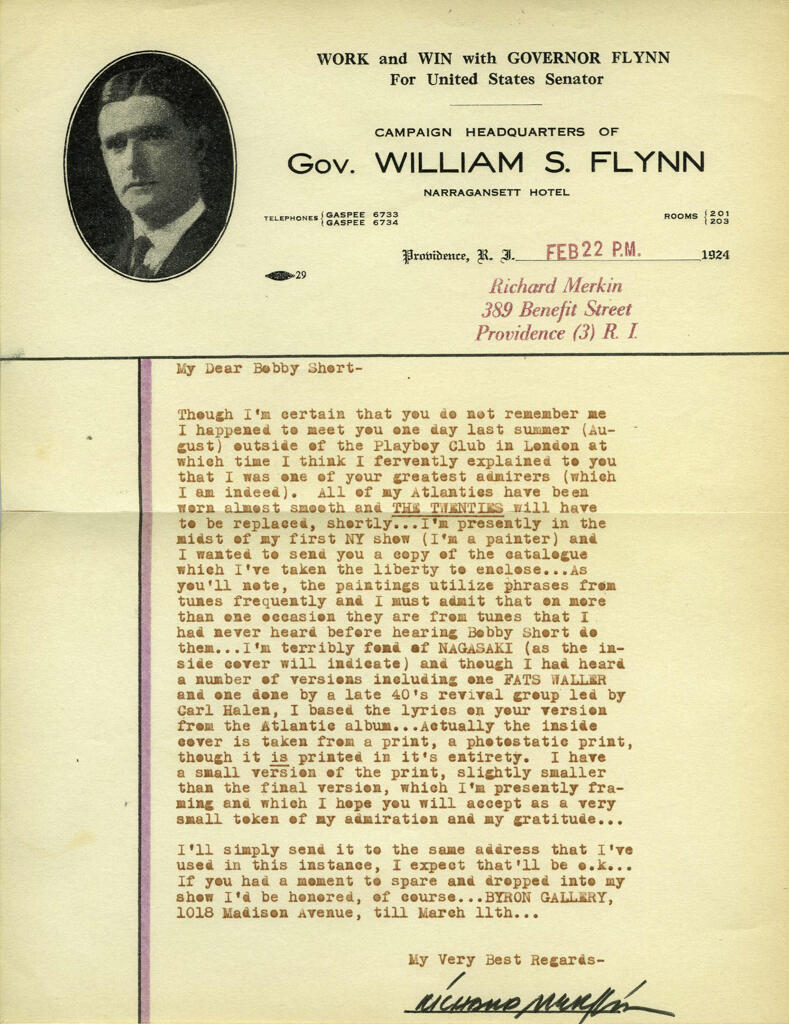We know of Merkin through a great deal of ephemera, both visual and written, collected in the RISD Archives: catalogues and postcards for gallery shows, course descriptions and syllabi, newspaper profiles about Merkin as an artist/collector/dandy, photographs, posters, and published pieces. This material documents his love for the period between the first and second world wars and its culture—high and low—which became subject matter for his paintings: baseball, boxing, cabarets, jazz and society orchestras, celebrity, cinema, comic strips, crime, and journalism. His interest in this era went beyond nostalgia; these times radiated a congruent respect for standards and traditions—for what had come before—even as boundaries were being tested. Emerging as an artist in the 1960s, Merkin was all about culture, not the counterculture.