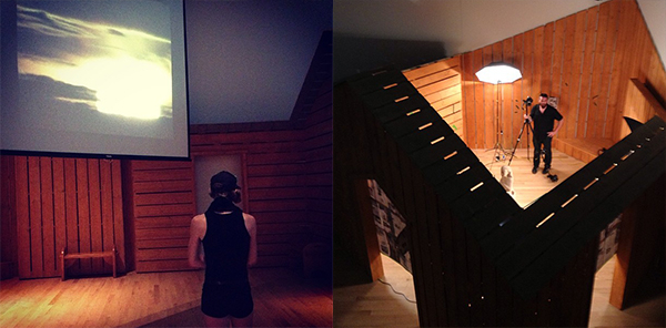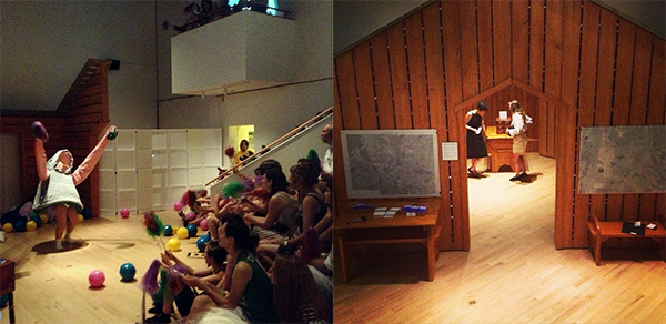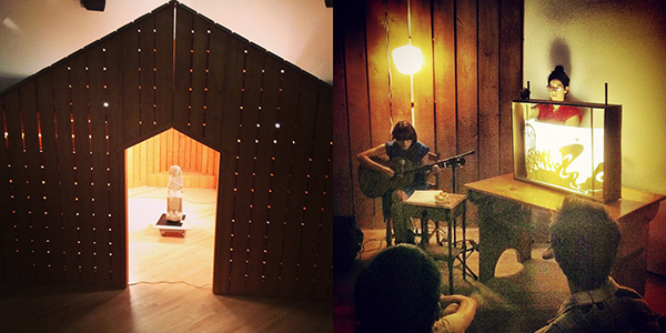 Process: As performers who create our own work, we approached the task of designing the Locally Made space by asking ourselves, “What would be the most ideal way to transform a Museum space into a performance venue for performers we know? What kind of existing space can we take inspiration from that accommodates performances, lectures, and community gatherings?” We acknowledged the pleasure of working in spaces that are not open; spaces that are already something; spaces that propose an environment that needs to be inhabited in order to come to life; in playing among fixed points rather than endless possibility and choice. Through these practical decisions, we designed a contained building inside the gallery inspired by Native longhouses and early American schoolhouses.