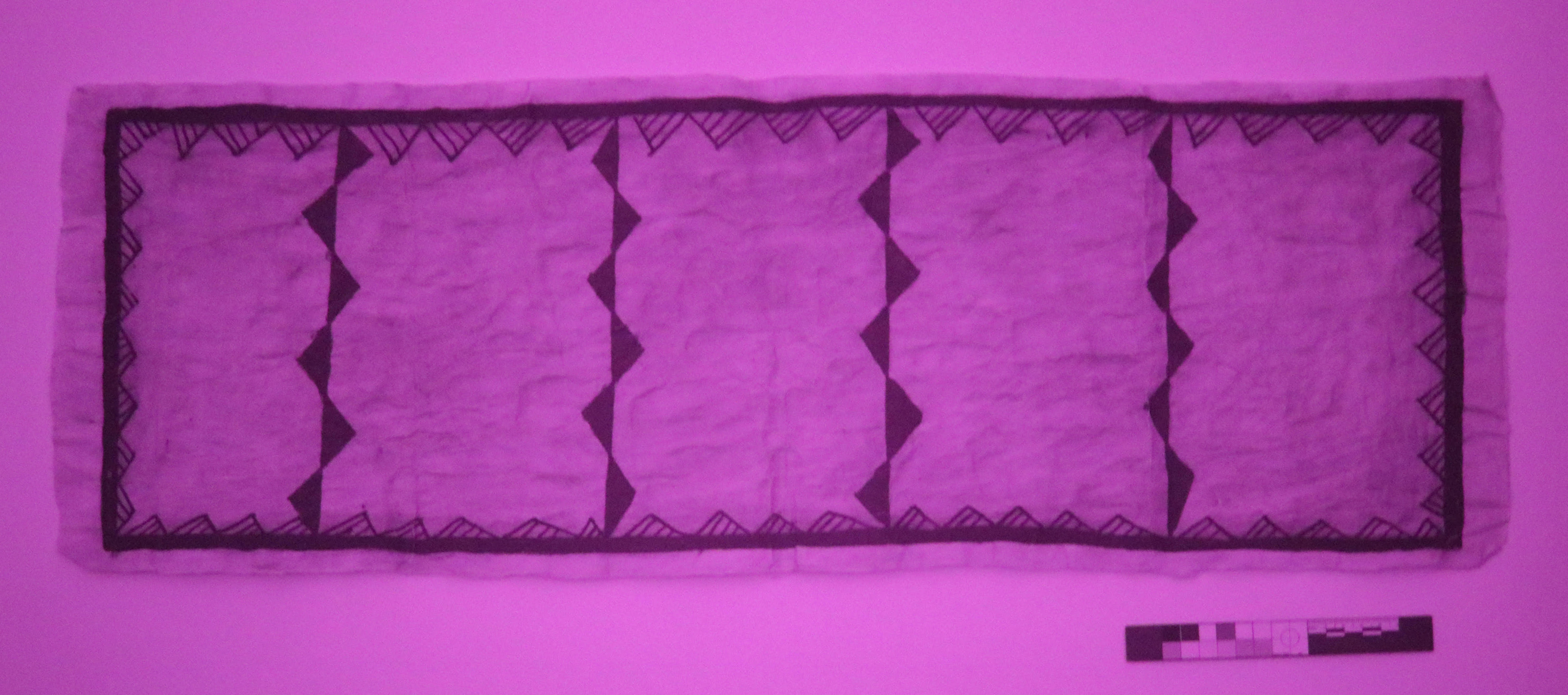 The original pattern, visible with an IR camera, has been overtaken by the darkening of the o’a. The new visual information from this image allows the siapo to be reinterpreted and seen again as it originally appeared.