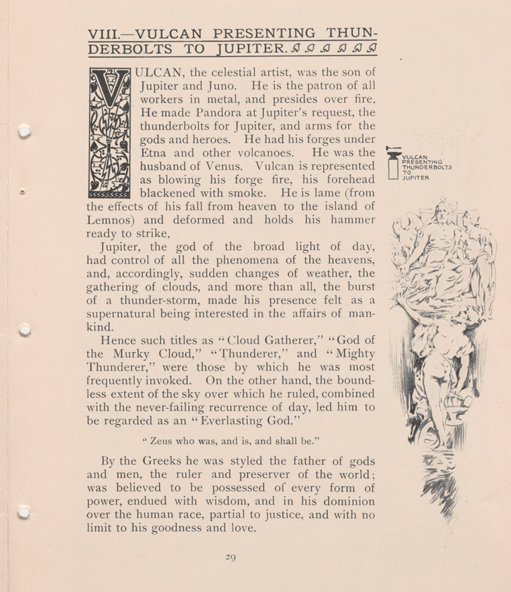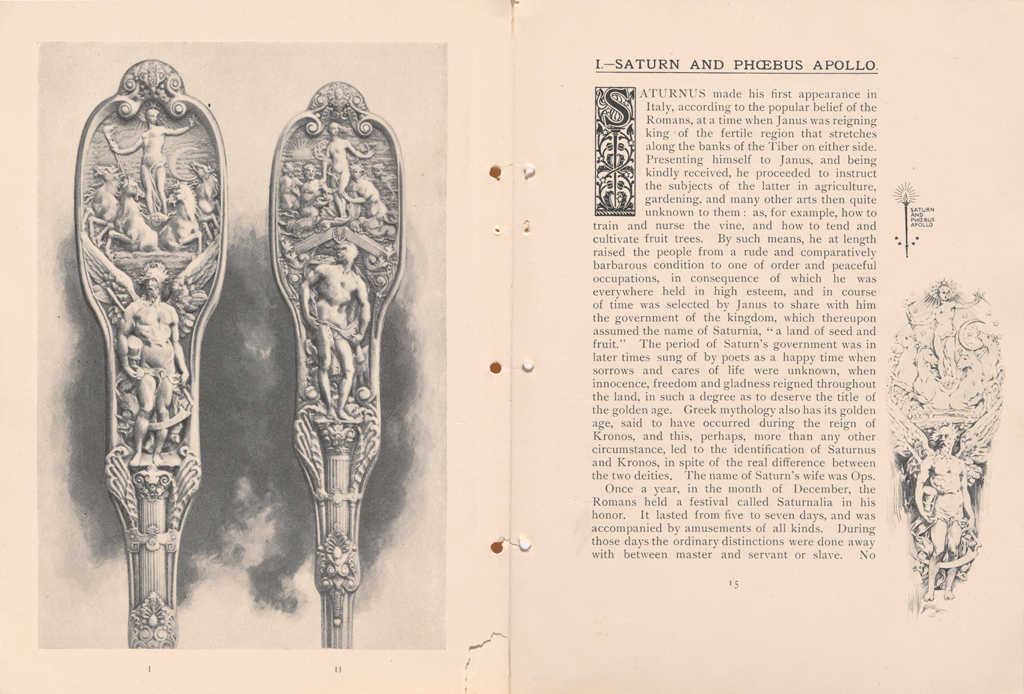 In 1895, Heller’s Mythologique was displayed at the Paris salon, where he was awarded a gold medal. In honor of the occasion, Gorham published a 60-page booklet celebrating the Mythologique pattern and Heller’s serious study of classical designs and their history. Following an introduction to mythology and the Mythologique pattern, each of the subjects depicted on the handles is illustrated and explained in a one to three-page description.