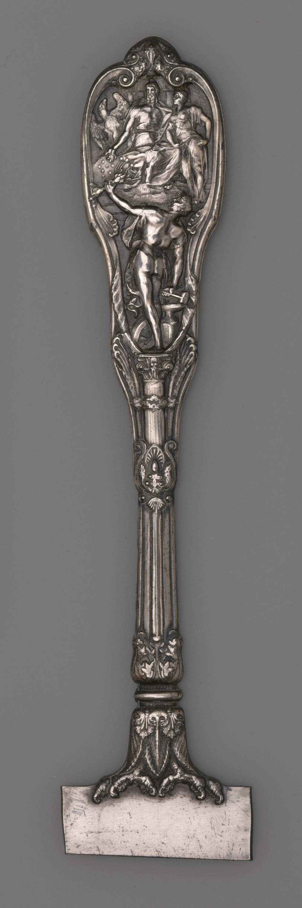 Should a dining table be set with a full set of Gorham’s Mythologique flatware, guests would enjoy a visual feast of 72 pieces of gleaming sterling silver made as place settings and serving implements. Each example was decorated with one of 24 intricately wrought mythological figures and scenes, surrounded by classical ornamentation. However, the particular set shown in the image above poses a serious challenge to diners: the functional ends are missing or only partially formed. Missing also is the graceful curve that allows a comfortable grasp and balance in a diner’s hand.